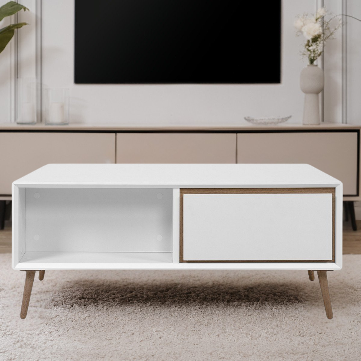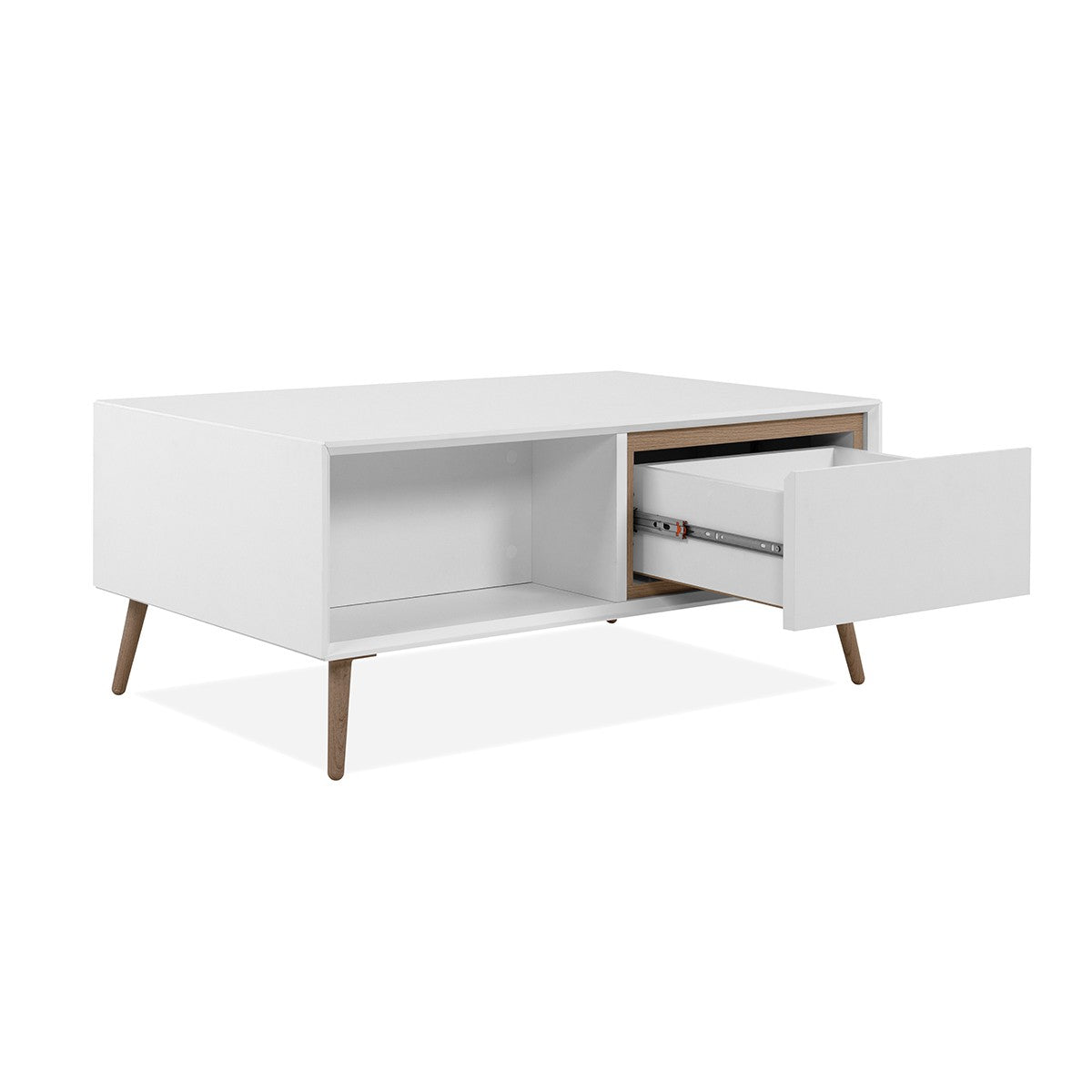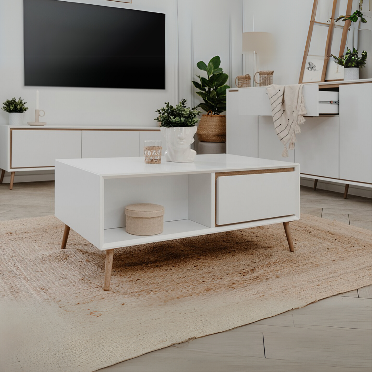 Productkenmerken: Salontafel, 1 lade en 1 vak aan elke kant. Zwarte plastic poten van 16 cm hoog. Melamine panelen van 18 mm dik. Afgeschuinde randen. Deuren sluiten met demper. Productafmetingen: Lengte 94 cm x Breedte 55 cm x Hoogte 40 cm - Nettogewicht: 29 kg. Afmetingen van de verpakking: Pakket nr. 1: Lengte 99 cm x Hoogte 12 cm x Diepte 61 cm - Bruto gewicht: 30 kg.