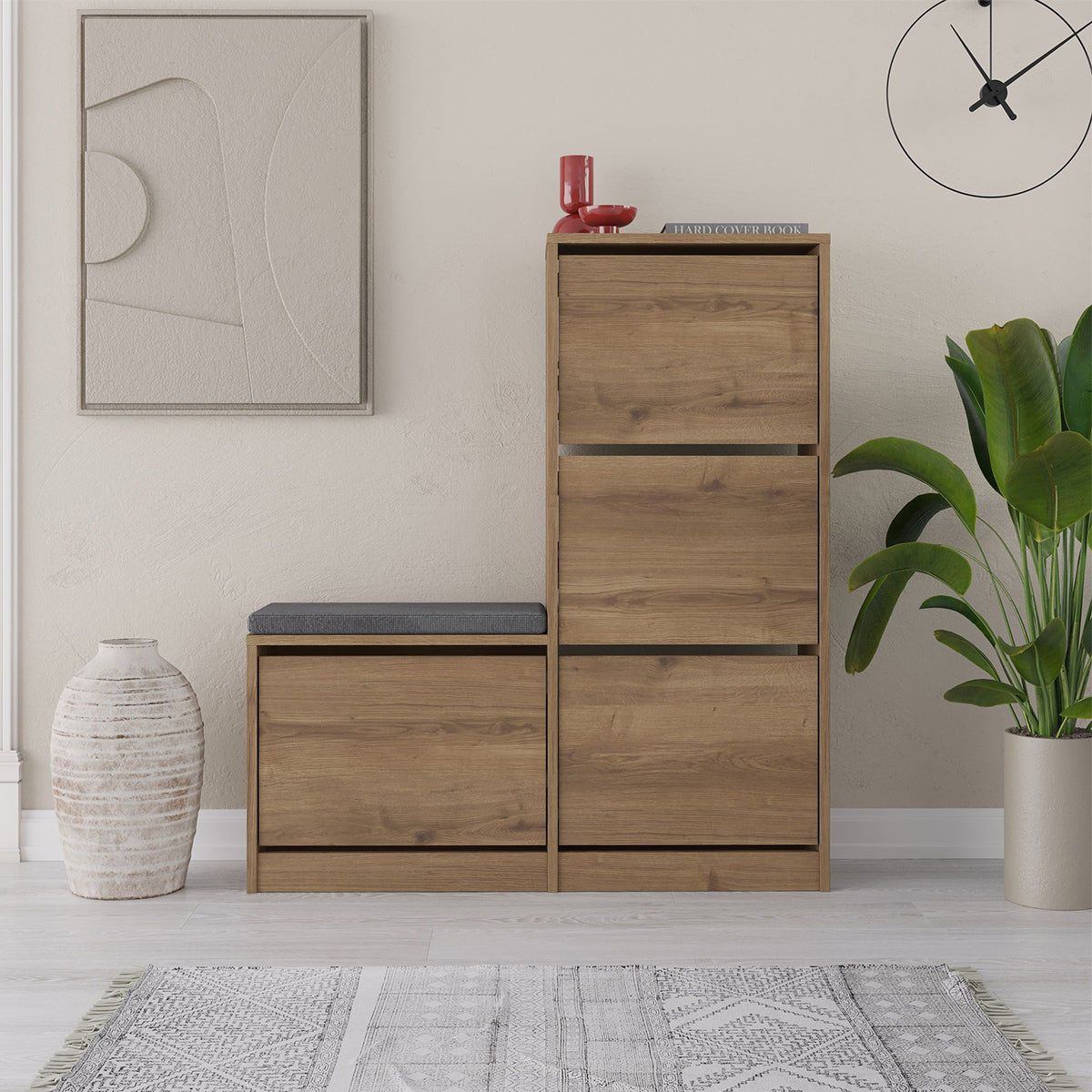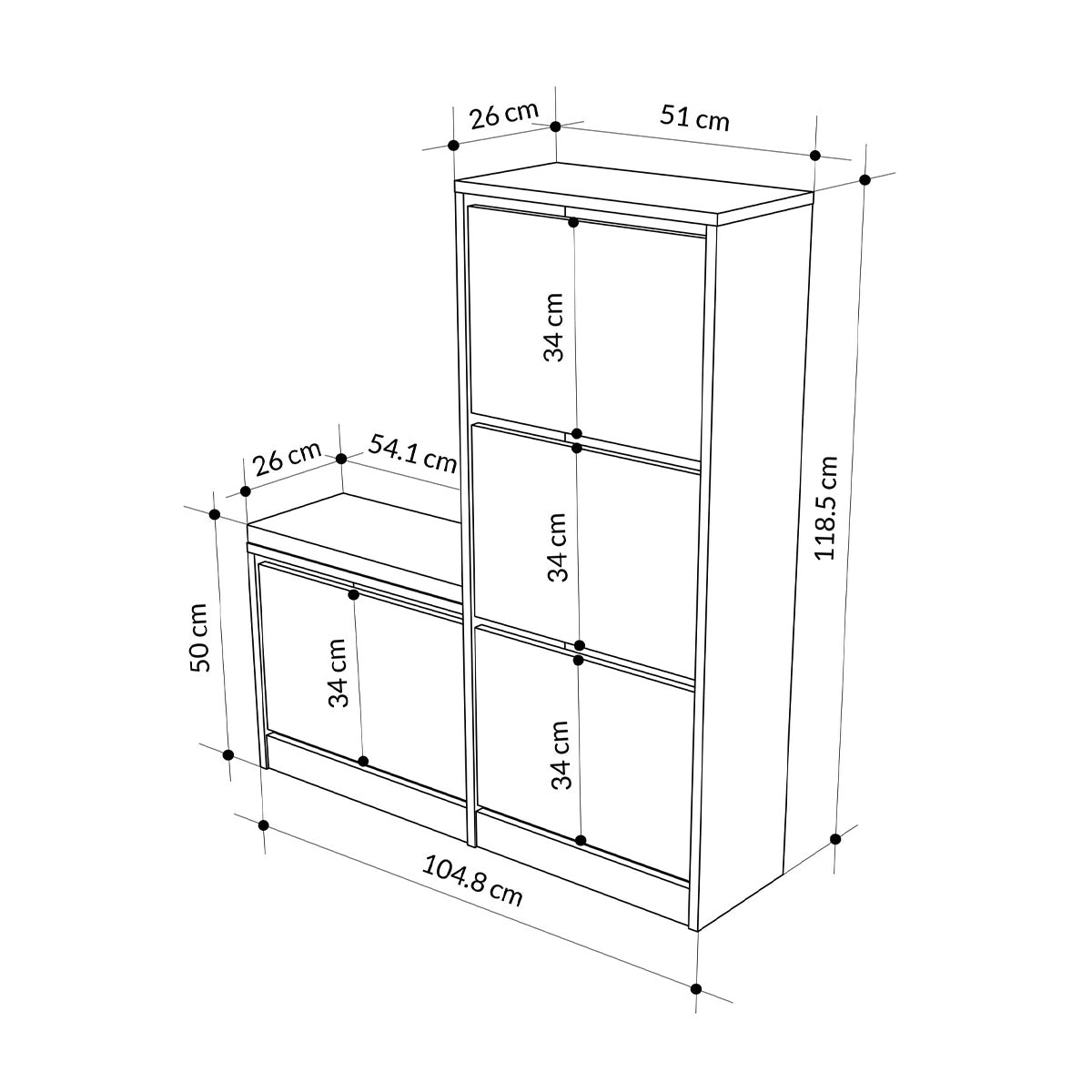 Productkenmerken: Onze schoenenkast is niet alleen een opbergoplossing. Zeer grote opbergruimte voor al uw schoenen. Gemaakt van 100% melamine spaanplaat. FSC-gecertificeerd, wat betekent dat het product is gemaakt van 100% gerecycled hout afkomstig uit duurzaam beheerde bossen. Productafmetingen: breedte 26 cm x lengte 105 cm x hoogte 118,5 cm - nettogewicht: 29,1 kg. Verpakkingsafmetingen: Pakket nr.1: lengte 39,8 cm x hoogte 131,1 cm x diepte 23,2 cm - bruto gewicht: 30 kg.