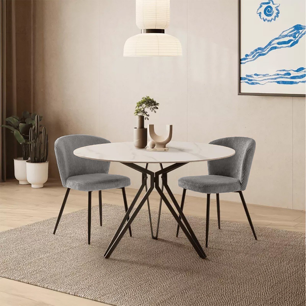 - Zit- en rugleuning: Stof, poten van zwart gelakt metaal.