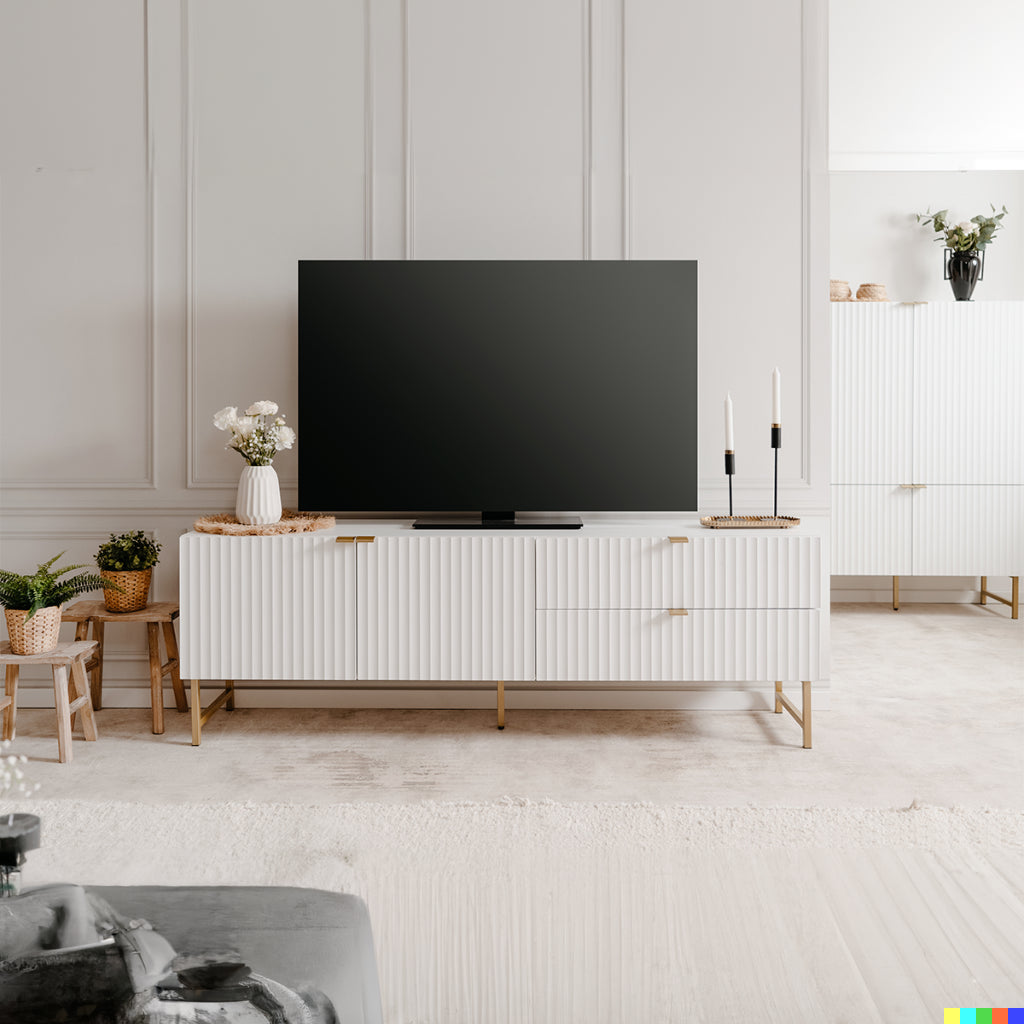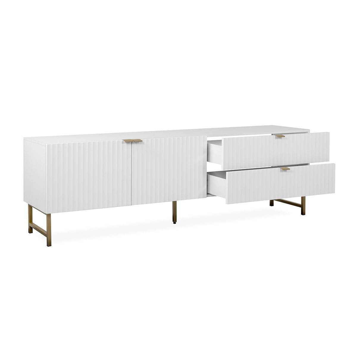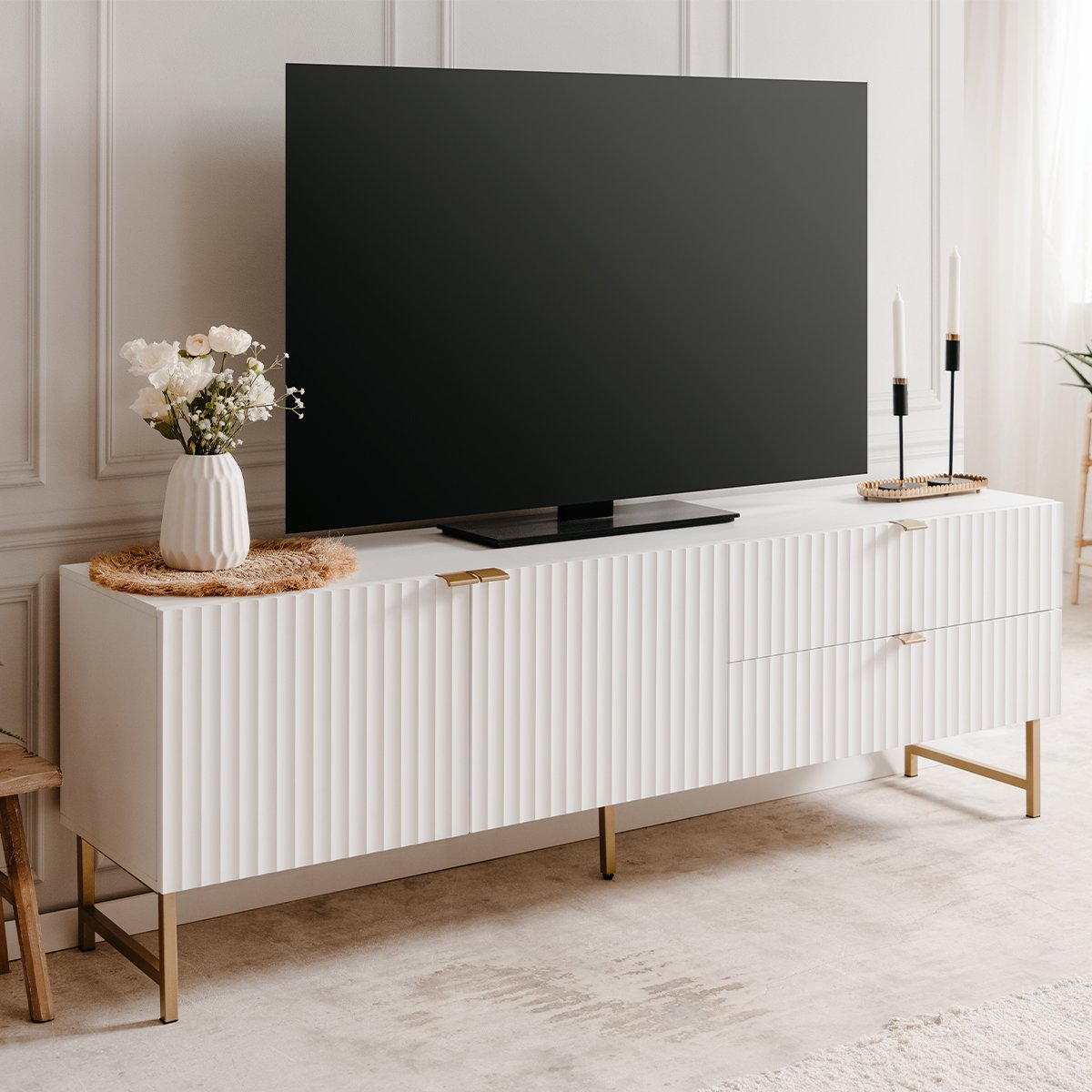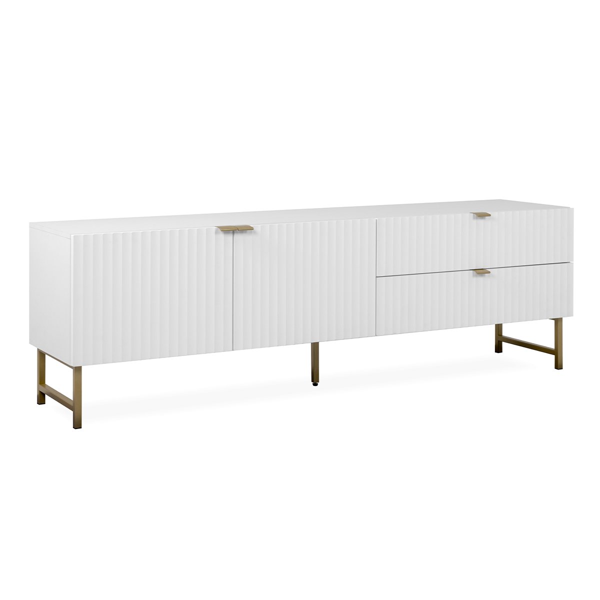 Productkenmerken: Buffet met 2 deuren, 2 laden, 1 plank achter elke deur. Kleur Wit. Voorkant met verticale gestructureerde uitstraling. Gemaakt van spaanplaat. Metalen poten. Geproduceerd in Europa (Duitsland). Productafmetingen: Lengte 179 cm x Breedte 40,5 cm x Hoogte 60,5 cm. Verpakkingsafmetingen: Pakket nr. 1: Breedte 94 cm x Lengte 45,5 cm x Diepte 14,5 cm - Bruto gewicht: 25,3 kg. Pakket nr. 2: Breedte 188,5 cm x Lengte 44,5 cm x Diepte 7,5 cm - Bruto gewicht: 21,2 kg.