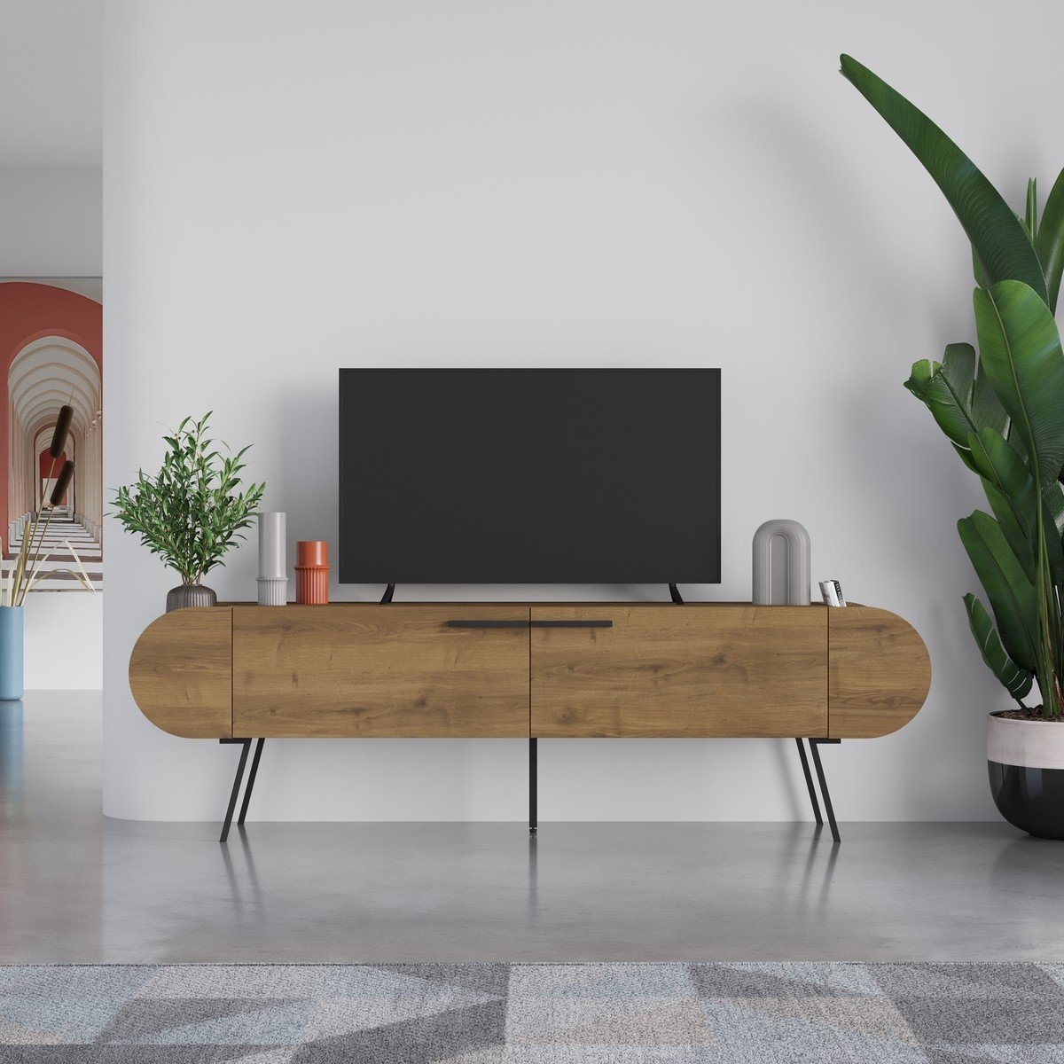 Productkenmerken: Dit eigentijdse lage meubel heeft een donkere houten structuur met afgeronde contouren, wat een unieke en moderne uitstraling toevoegt. Gemonteerd op zwarte metalen schuine poten, biedt het stabiliteit en stijl. De deuren verbergen een ruime opbergruimte, perfect voor een elegant en functioneel interieur. Het strakke ontwerp en de gebogen lijnen brengen een verfijnde esthetiek in je woonkamer, waar functionaliteit en moderniteit perfect samenkomen. Productafmetingen: Lengte 194,5 cm x Breedte 37,6 cm x Hoogte 57,7 cm - Nettogewicht: 29,4 kg.