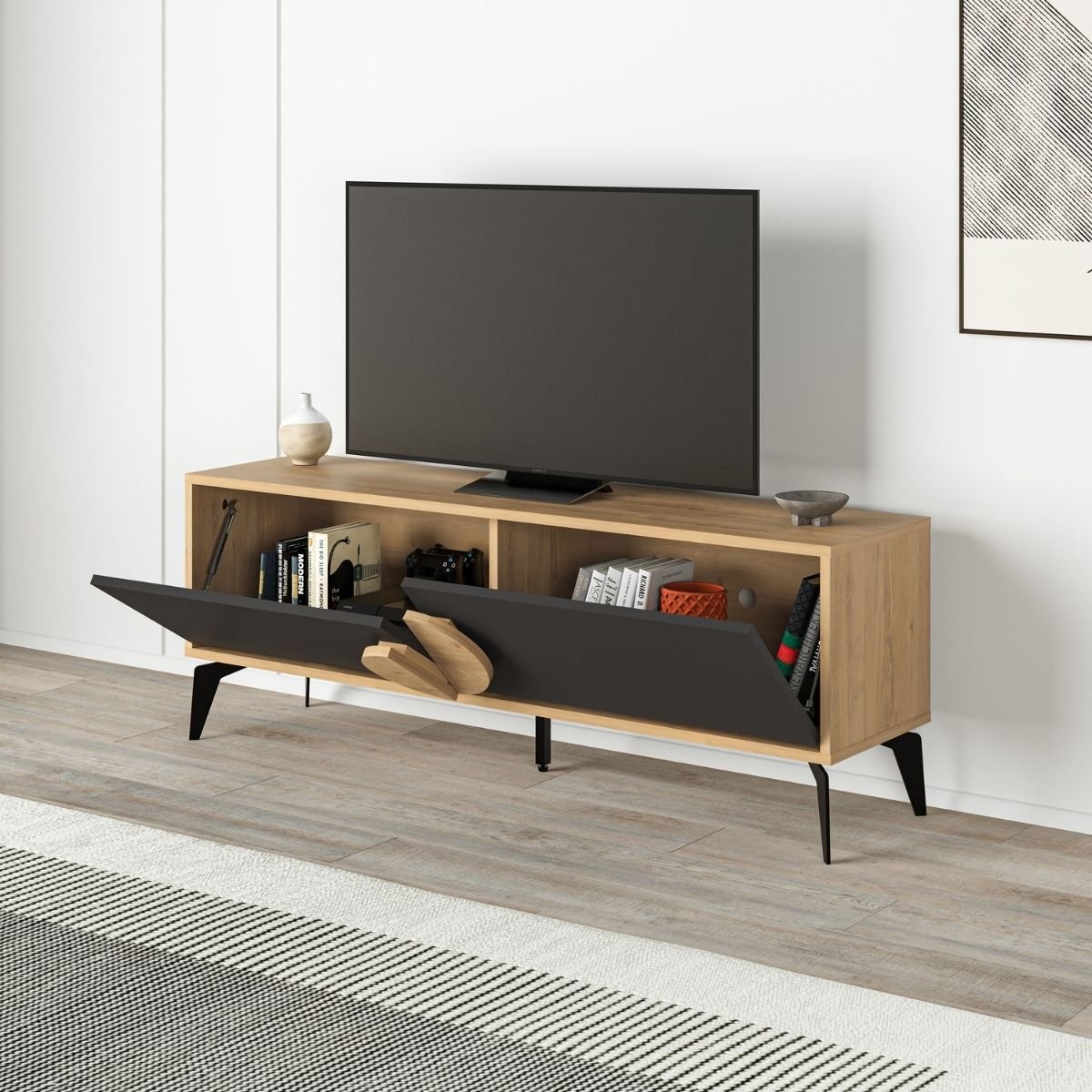 Productkenmerken: Structuur van gelamineerde spaanplaten van 18 mm in eikenkleur / deuren van gelamineerde spaanplaten van 18 mm in antracietzwarte kleur. Ronde handgrepen van gelamineerde spaanplaten in eikenkleur. Metalen poten. Het detail van de ronde handgreep in eikenkleur, geïnspireerd door Azië, voegt een vleugje elegantie toe aan uw interieur en creëert een rustige en verfijnde sfeer. Deze meubels zijn ontworpen om harmonieus in verschillende decors te passen en een uniek tintje aan uw ruimte toe te voegen. Productafmetingen: Lengte 140 cm x breedte 35 cm x hoogte 51 cm - Nettogewicht: 27,5 kg. Afmetingen van de verpakking: Verpakking nr. 1: Lengte 152,8 cm x breedte 40,5 cm x hoogte 14 cm - Brutogewicht: 28,55 kg.