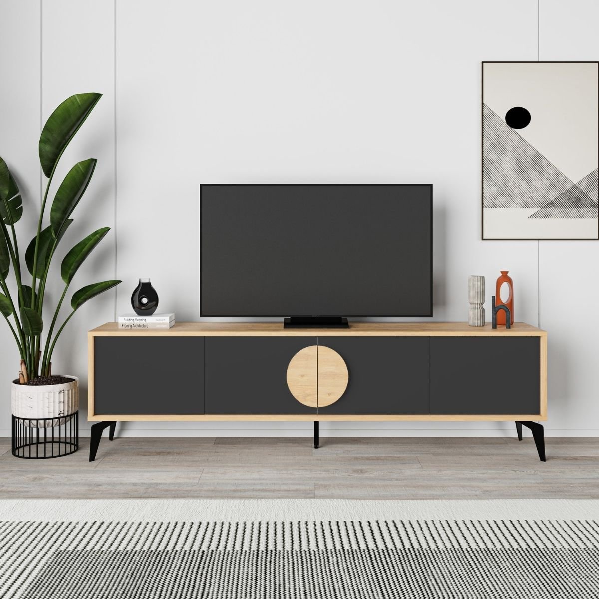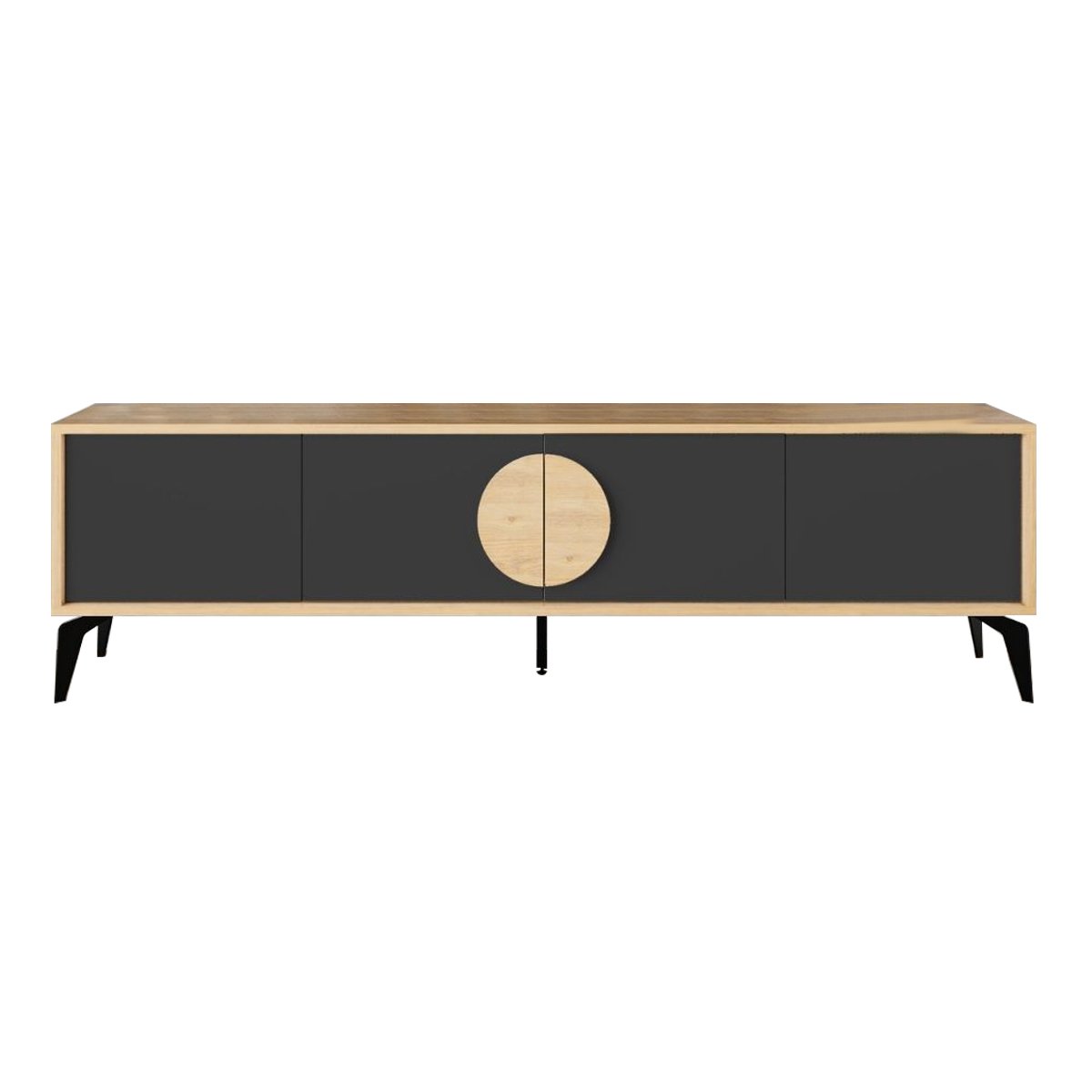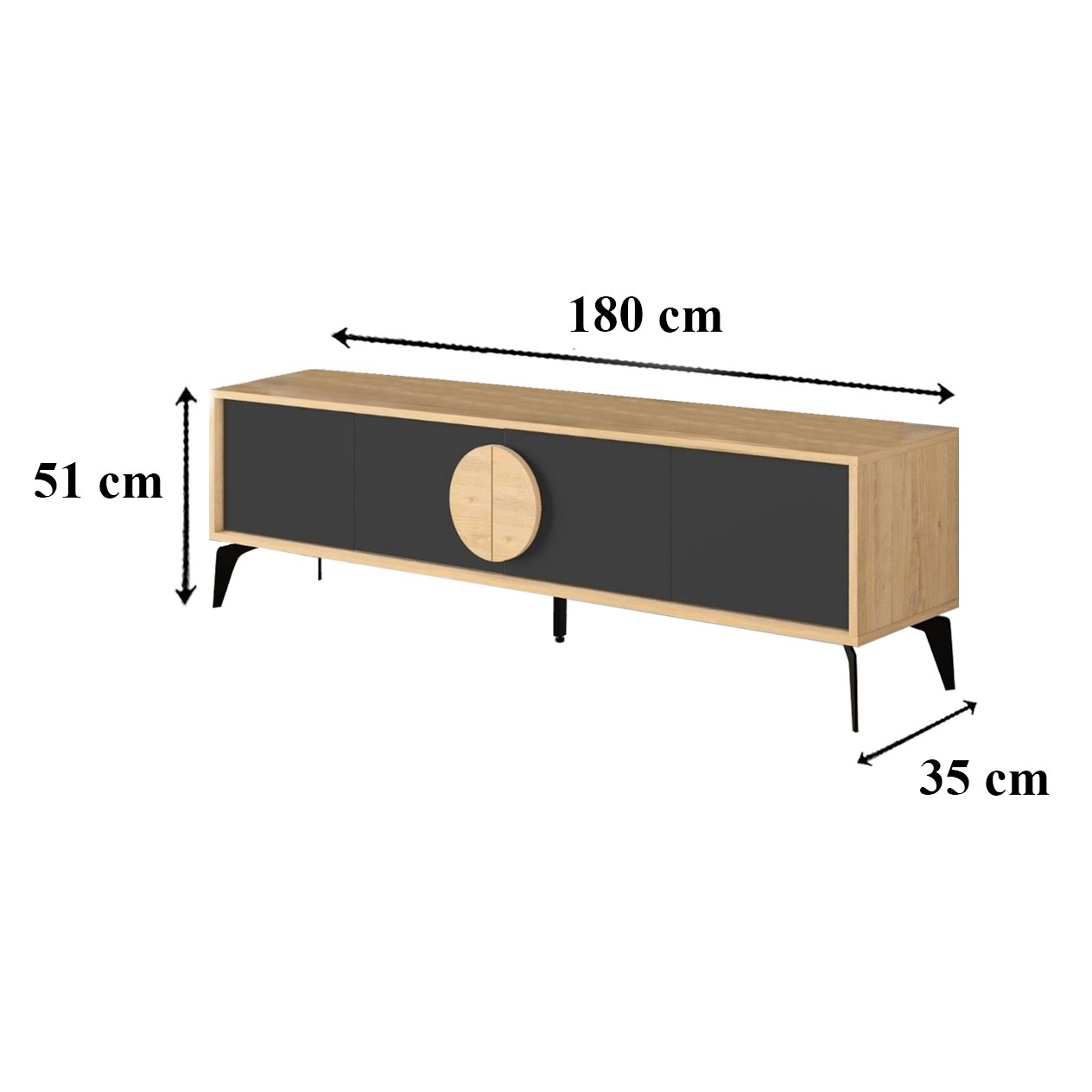 Productkenmerken: Structuur van 18 mm gelamineerde spaanplaat in eikenkleur / deuren van 18 mm gelamineerde spaanplaat in antracietzwarte kleur. Ronde handgrepen van gelamineerde spaanplaat in eikenkleur. Metalen poten. Het detail van de ronde handgreep in eikenkleur, geïnspireerd door Azië, voegt een vleugje elegantie toe aan uw interieur en creëert zo een rustgevende en verfijnde sfeer. Deze meubels zijn ontworpen om harmonieus in verschillende interieurs te passen, terwijl ze een unieke touch aan uw ruimte toevoegen. Productafmetingen: Lengte 180 cm x breedte 35 cm x hoogte 51 cm - Nettogewicht: 33,3 kg. Verpakkingsafmetingen: Pakket nr. 1: Lengte 192,5 cm x breedte 40,9 cm x hoogte 15,5 cm - Brutogewicht: 36,7 kg.