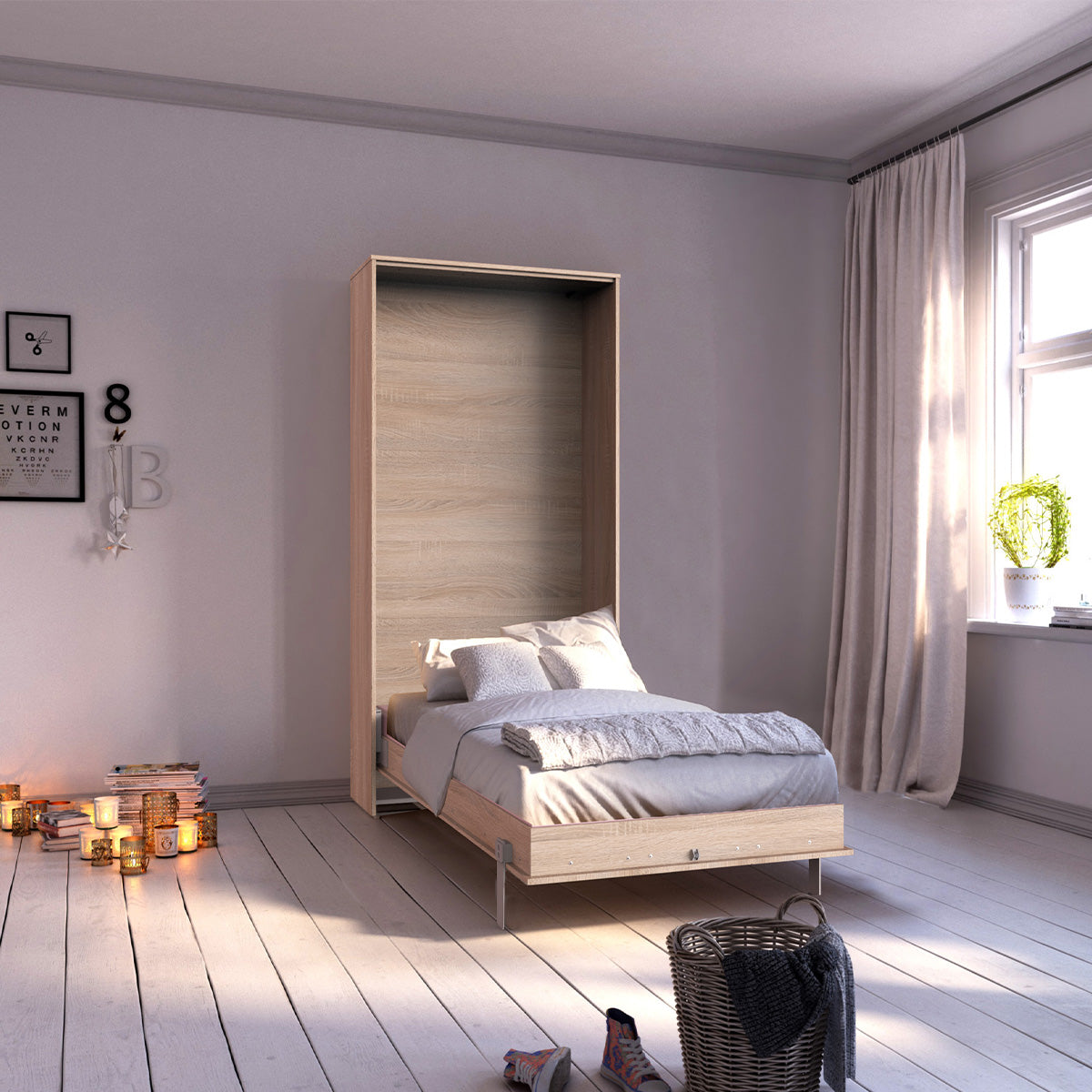 Ontdek onze Verticaal opklapbaar bed 90x200 - L102 cm. Perfect voor kleine ruimtes zoals studentenwoningen of multifunctionele kamers, dit opklapbare bed transformeert zeer eenvoudig. Eenmaal gesloten neemt het weinig ruimte in beslag, waardoor er veel meer ruimte overblijft in de kamer. Het strakke en discrete ontwerp van het meubilair past bij elk interieur. Productkenmerken: Opklapbaar bed. Hoofdmateriaal: Gelamineerde spaanplaten. Twee beschikbare kleuren: Eiken decor / Wit. Lattenbodem inbegrepen. Maximale matrashoogte (niet inbegrepen): 185 mm. Maximale matrasgewicht (niet inbegrepen): 9 tot 13 kg. Productafmetingen: Lengte 102 cm x Hoogte 213 cm x Diepte 43 cm - Nettogewicht: 108 kg. Afmetingen verpakking: Verpakking nr. 1: Breedte 70,4 cm x Diepte 215,6 cm x Hoogte 7,8 cm - Bruttogewicht: 35 kg. Verpakking nr. 2: Breedte 43,2 cm x Diepte 106,6 cm x Hoogte 11 cm - Bruttogewicht: 37 kg. Verpakking nr. 3: Breedte 33,1 cm x Diepte 209,5 cm x Hoogte 5,7 cm - Bruttogewicht: 23 kg. Verpakking nr. 4: Breedte 37,3 cm x Diepte 47,5 cm x Hoogte 13,2 cm - Bruttogewicht: 19 kg. Totale bruto gewicht: 114 kg.