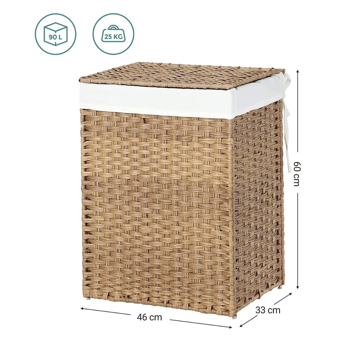 Productkenmerken: Wasmand van synthetisch rotan 90L. Met de hand gewevenVerwijderbare waszak van katoenen stofPlastic voeten voor betere grip op de vloerGeïntegreerde handgrepen voor gemakkelijk transportAfmetingen van de zak: Lengte 46 cm x Breedte 33 cm x Hoogte 60 cmStatische draagcapaciteit: 25 kg. Productafmetingen: Breedte 32 cm x Lengte 45,5 cm x Hoogte 61 cm - Netto gewicht: 3,8 kg. Pakketafmetingen: Breedte 7 cm x Hoogte 52 cm x Diepte 66 cm - Brutogewicht: 3,8 kg.