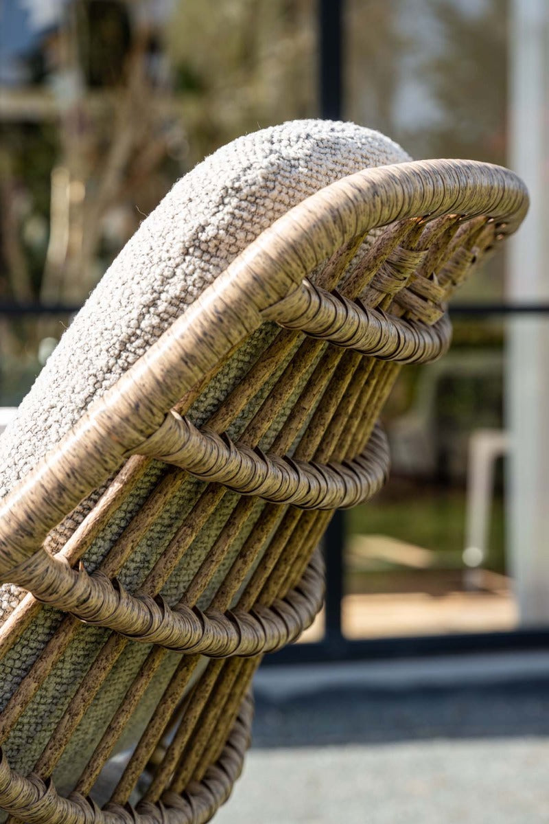 De Castello loungestoel van Garden Impressions zorgt in een handomdraai voor een frisse uitstraling in jouw tuin! Bovendien biedt de stoel een uitzonderlijk comfort. Het uitstekende zitcomfort, samen met het elegante ontwerp, maakt dat je deze stoel niet kunt missen. De Castello stoel heeft een robuust aluminium frame, en de kuip is afgewerkt met stijlvol, tijdloos wicker. De kussens zijn vervaardigd uit boucle garen, wat ze een zachte, teddy-look geeft en zorgt voor een heerlijk zacht gevoel. De kussens zijn waterafstotend, wat betekent dat je eenvoudig enkele regendruppels van de kussens kunt afkloppen. De afmetingen van de Castello stoel zijn 80 x 75 x H87,5 cm, met een zithoogte van 44 cm.