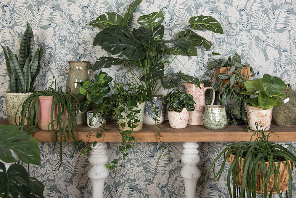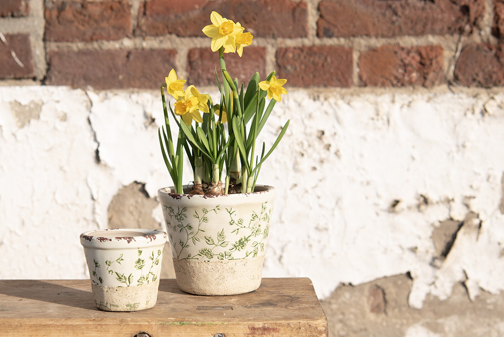 Clayre & Eef Bloempot Ø 12x10 cm Groen Wit Keramiek Bladeren