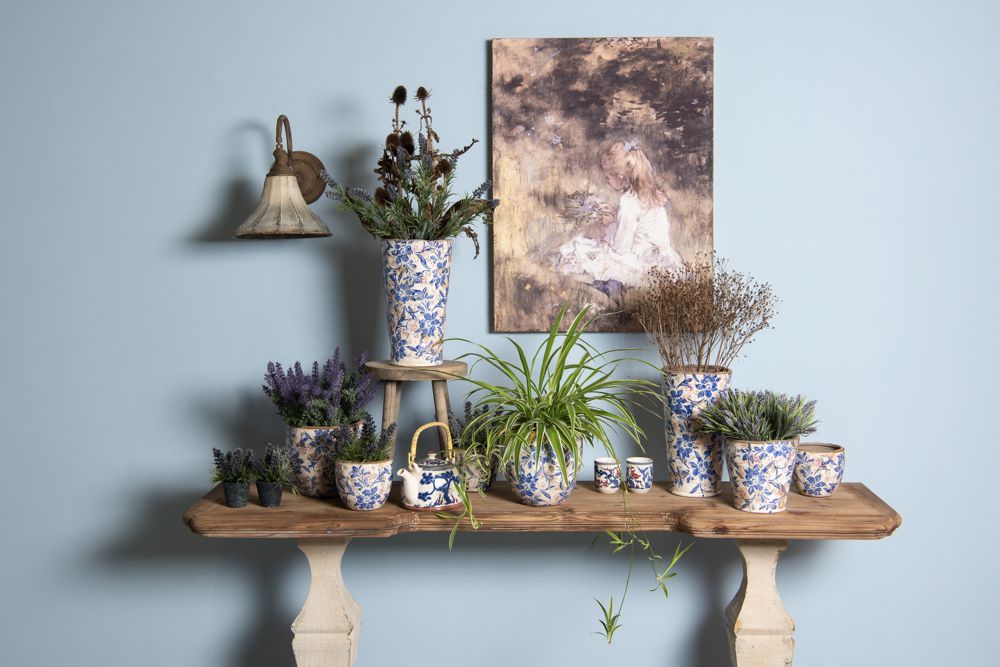 Clayre & Eef Bloempot Ø 13x11 cm Blauw Beige Keramiek Bloemen
