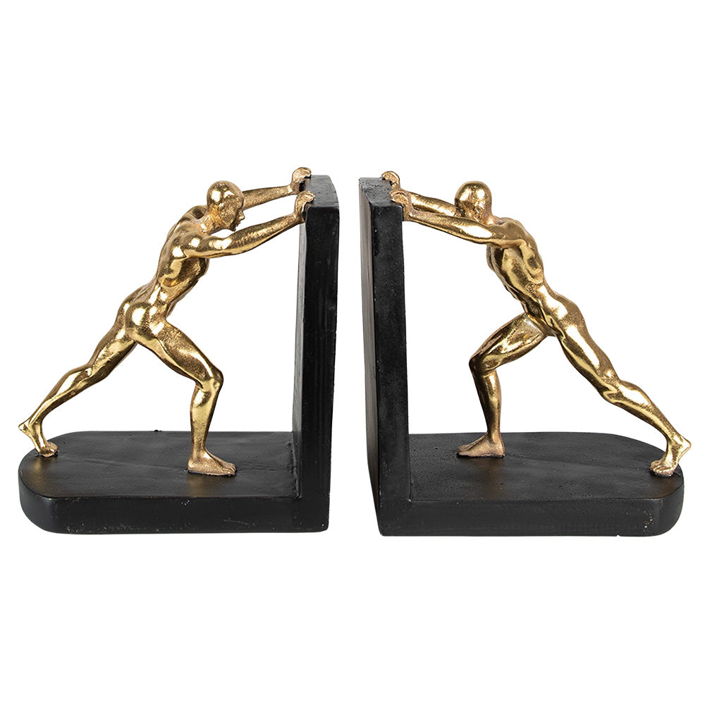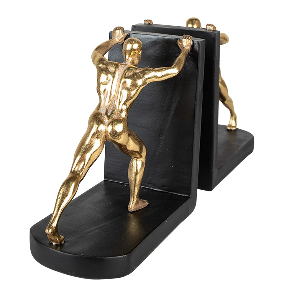 Set van twee moderne decoratieve zwarte boekensteunen, met op iedere boekensteun een goudkleurig beeldje van een mens, van het merk Clayre & Eef. Afmeting van één boekensteun 16x9x17 cm.