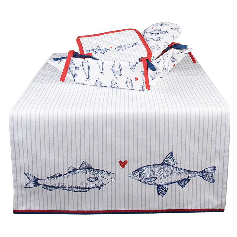 Met deze textielserie is het vakantiegevoel meteen binnen handbereik. Het prachtig vormgegeven vissen paar staat in deze serie centraal en zorgt voor een fijne dosis liefde. Net zoals u met liefde de tafel dekt voor het gezin of voor gasten. Het is een kleine maar zeer functionele serie, die zowel op tafel als in de keuken een zomers tintje geeft. Met items zoals tafellopers, placemats, servetten, broodmandjes en het bijpassende servies is eten in de buitenlucht een feest. Geniet van deze zomerse collectie!