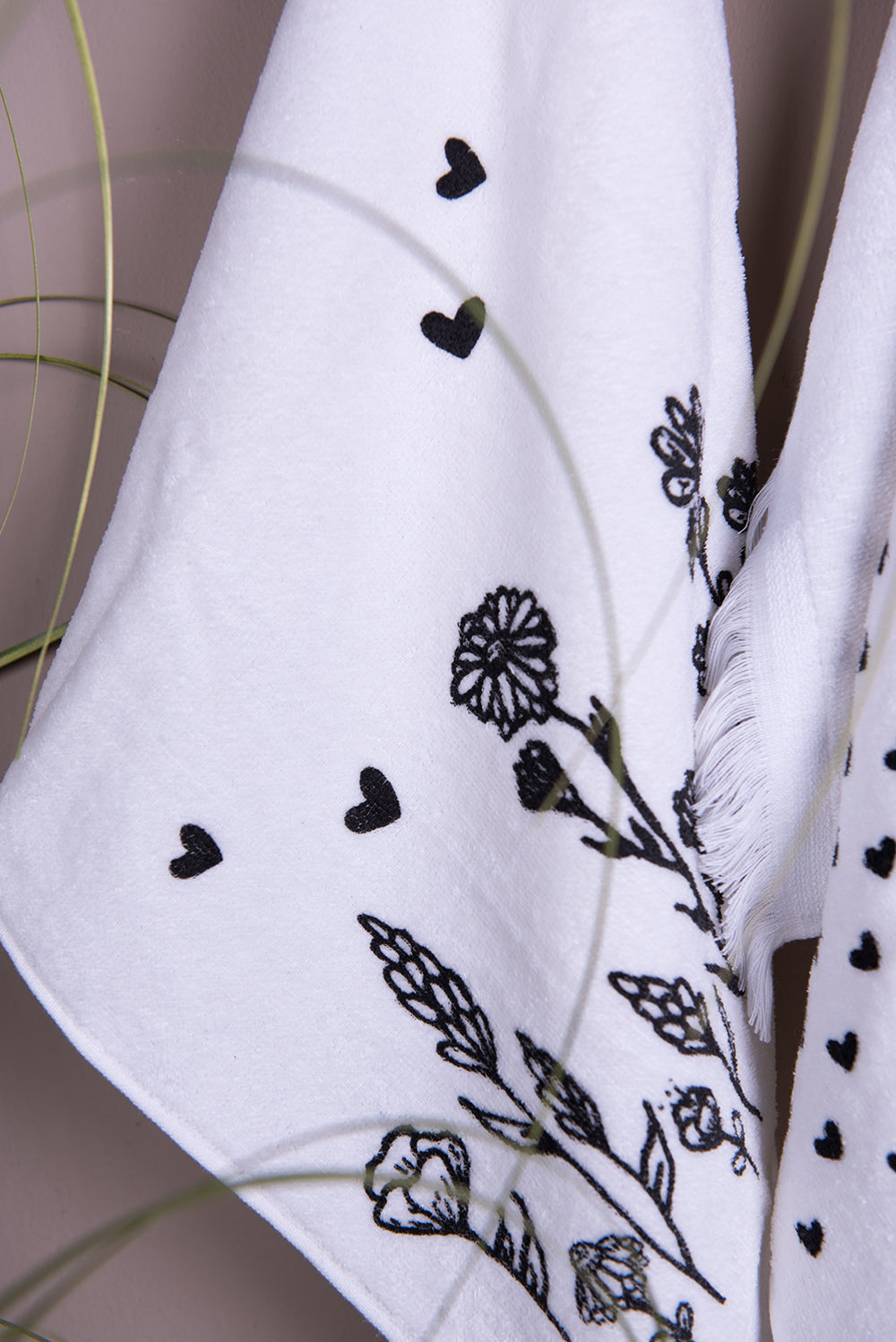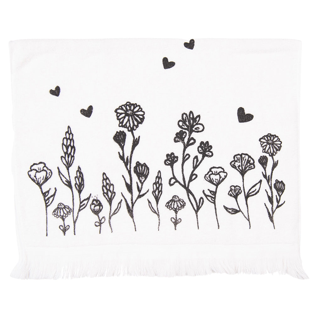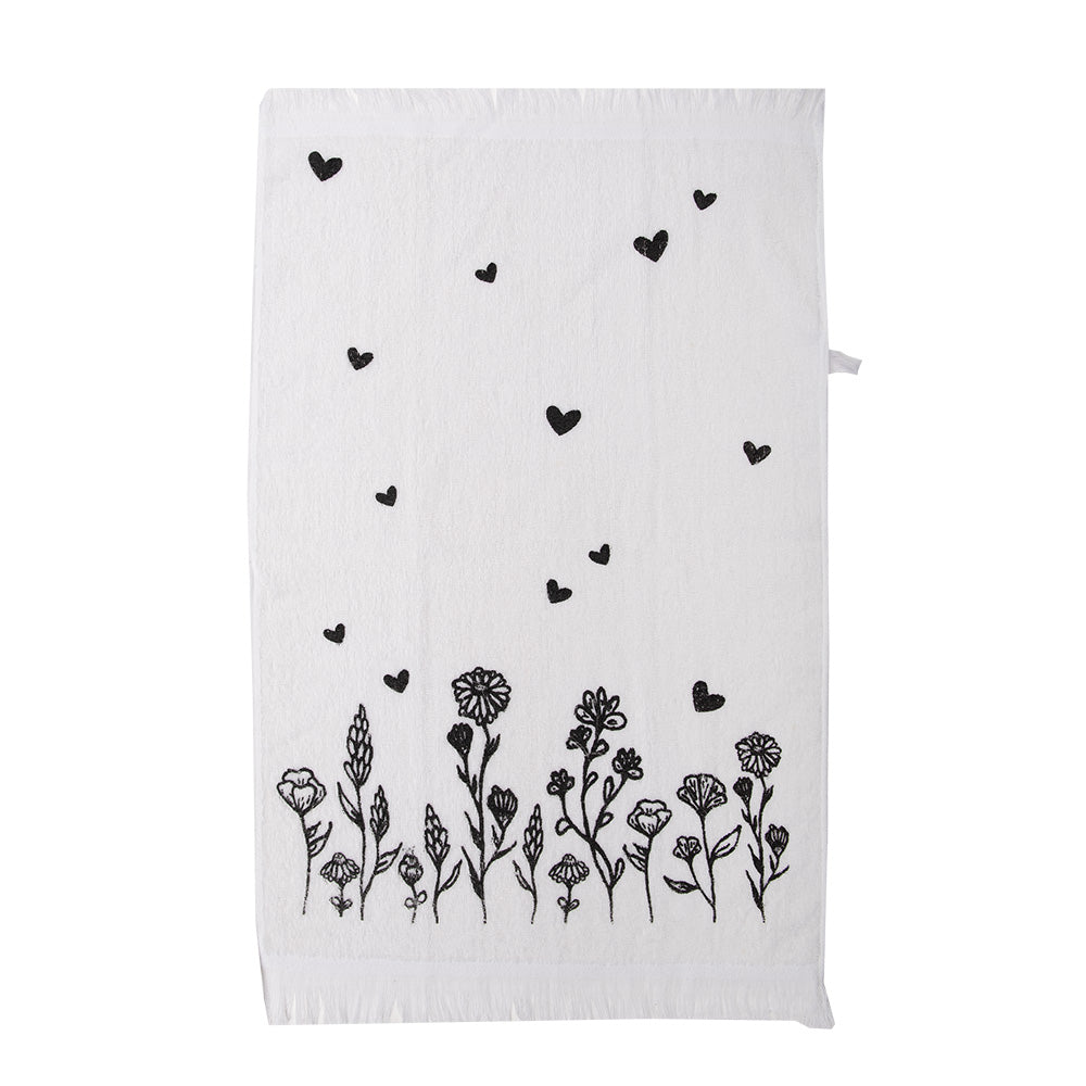 Deze vrolijke Toilethanddoek/Gastendoekje van het merk Clayre & Eef met bloemen en hart motief op een witte achtergrond is mooi en praktisch tegelijk. De zwarte print in een landelijke stijl met een romantische uitstraling geeft een gezellige en leuke sfeer aan je toilet/keuken. De toilethanddoek/gastendoekje is gemaakt van 100% katoen en is voorzien van een handig lusje om de toilethanddoek/gastendoekje op te hangen. De afmeting van de toilethanddoek/gastendoekje is 40x66 cm . Staat mooi in jouw toilet/keuken en past binnen elk interieur. Onze toilethanddoek/gastendoekje kunnen gewassen worden in de wasmachine. Met home-textiel van Clayre & Eef wordt jouw thuis nog gezelliger!