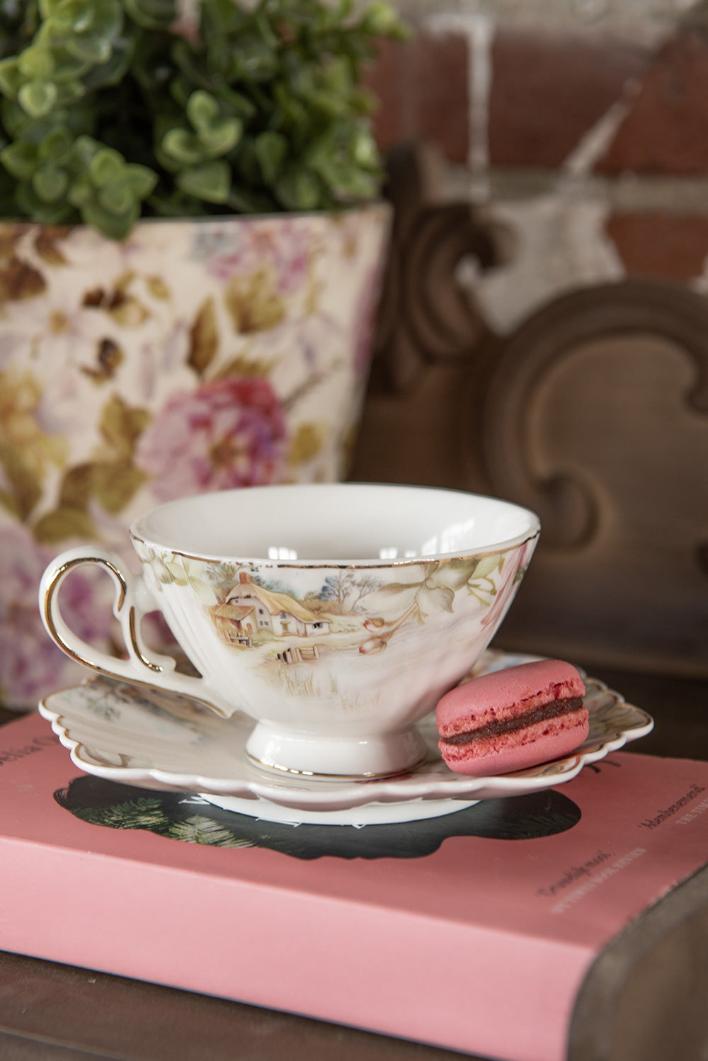 Clayre & Eef Kop en schotel 200 ml Wit Roze Porselein Rond Bloemen