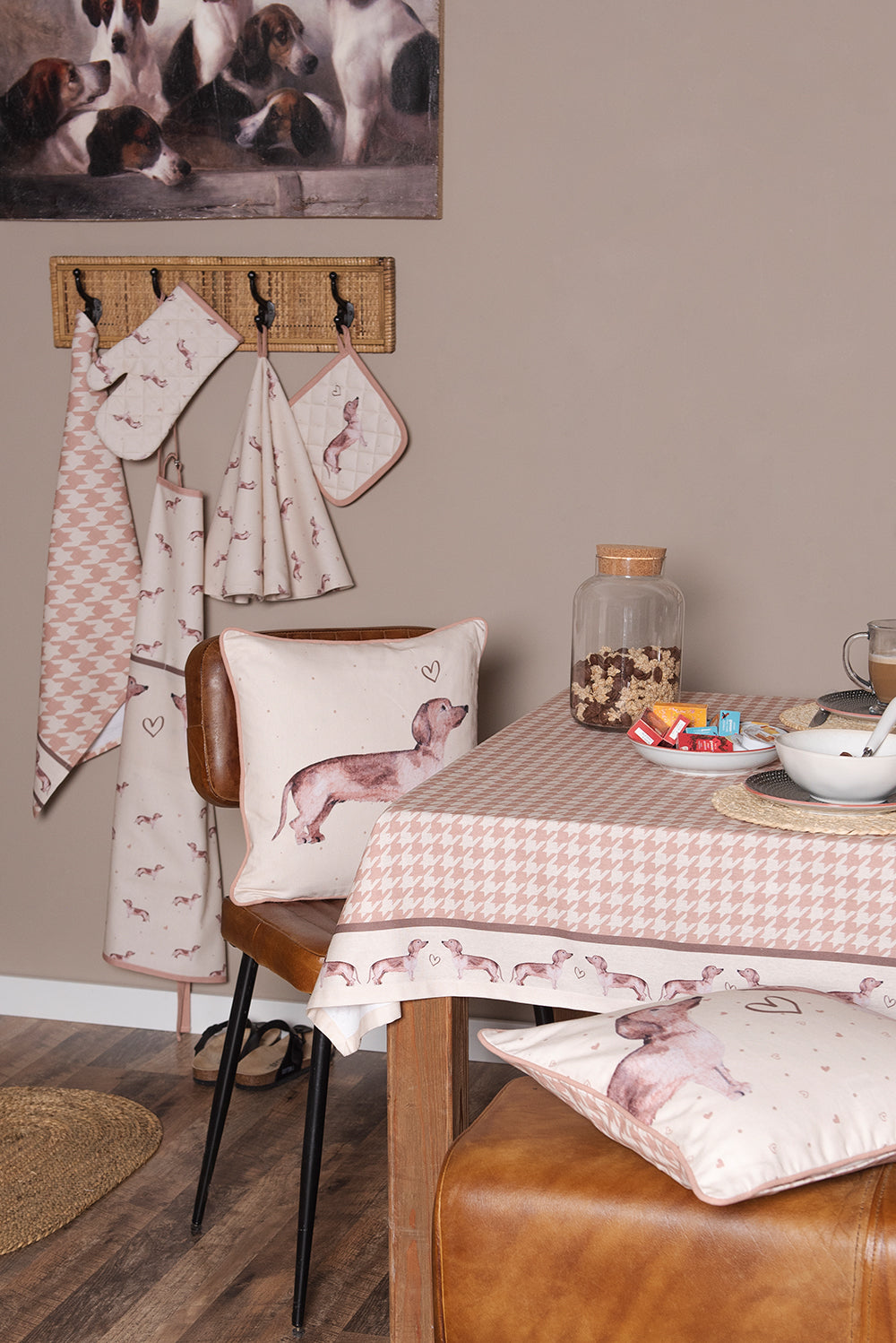Wie is er nu niet gek op Teckels! Dit vrolijke maar eigenwijze ras, staat centraal in deze textielcollectie. De mooie bruinaccenten en vrolijke patronen laten het hart van elke hondenliefhebber sneller kloppen. De ovenhandschoen, pannenlap en ovenschort is zowel voor volwassenen als kinderen beschikbaar. De sierkussens geven extra sfeer en tovert elke ruimte om tot een gezellige ruimte. De stoffen broodmanden, theedoeken, tafelkleden en tafellopers zijn allemaal fraai vormgegeven en vormen een mooi geheel aan tafel en in de keuken.