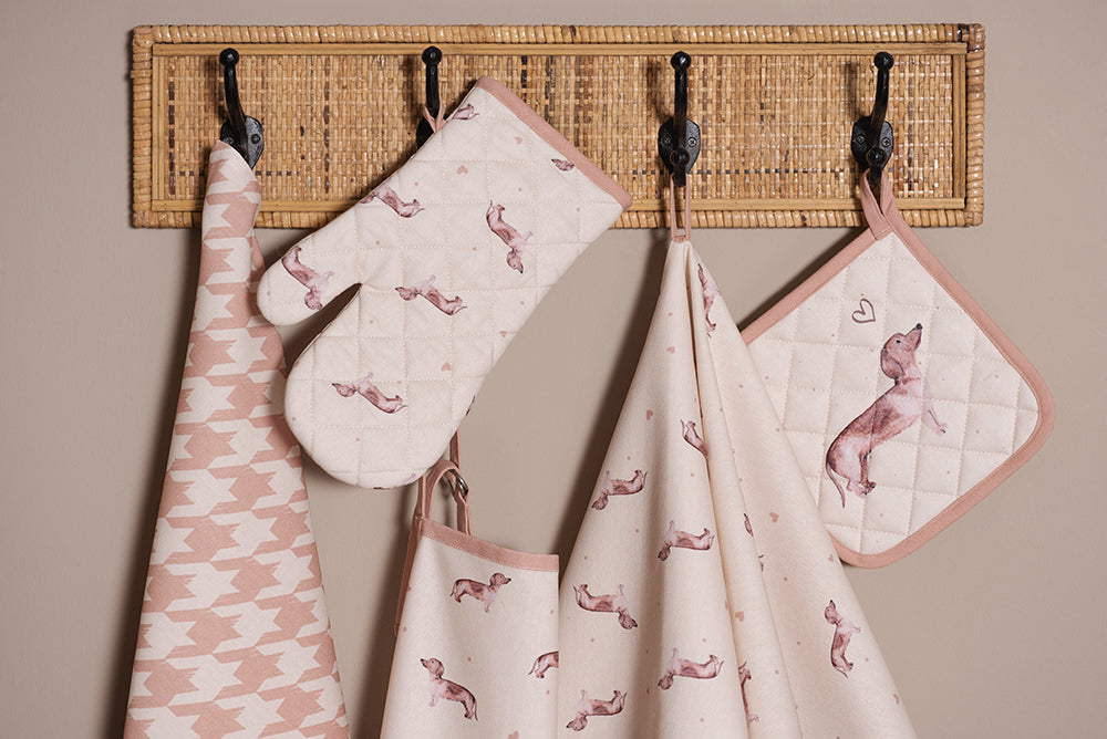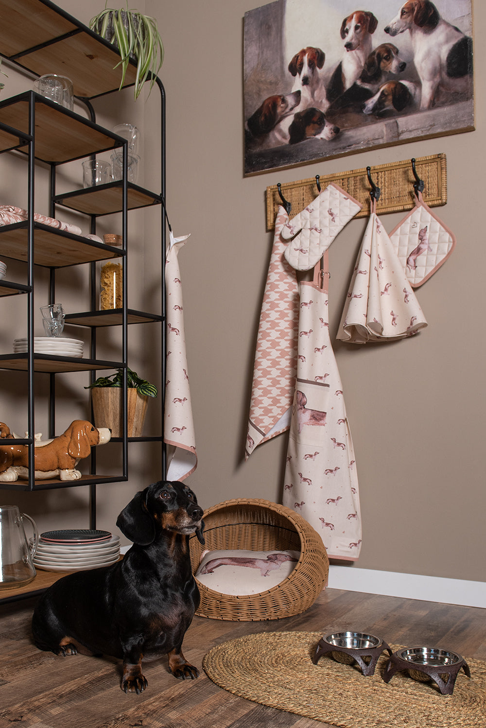 Wie is er nu niet gek op Teckels! Dit vrolijke maar eigenwijze ras, staat centraal in deze textielcollectie. De mooie bruinaccenten en vrolijke patronen laten het hart van elke hondenliefhebber sneller kloppen. De ovenhandschoen, pannenlap en ovenschort is zowel voor volwassenen als kinderen beschikbaar. De sierkussens geven extra sfeer en tovert elke ruimte om tot een gezellige ruimte. De stoffen broodmanden, theedoeken, tafelkleden en tafellopers zijn allemaal fraai vormgegeven en vormen een mooi geheel aan tafel en in de keuken. Ovenwant Ovenhandschoen