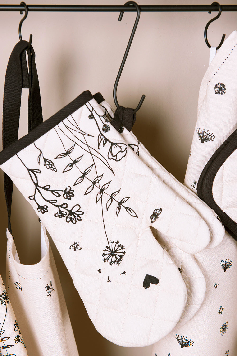 Een mooie strakke textielserie die zich thuis zal voelen in elk modern interieur. Omarm de natuur met haar bloemetjes en bijtjes. Een serie die op vele vlakken een aanvulling zal zijn. Denk aan keukentextiel zoals keukendoeken, keukenschorten, pannenlappen en ovenwanten. Maar ook aan tafel zal deze serie voor veel sfeer zorgen. Tafelkleden, broodmanden, placemats en servetten zorgen voor een mooi gedekte tafel en met het aanvullende servies is deze hele serie een absolute must-have. Geniet van de flora & fauna en de mooie momenten aan en om tafel. Ovenwant Ovenhandschoen