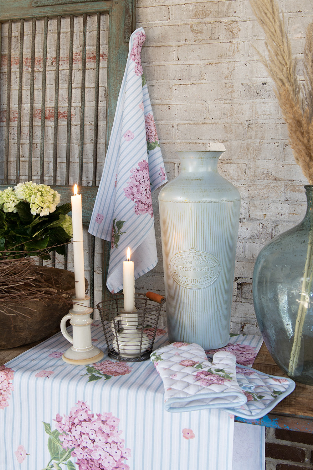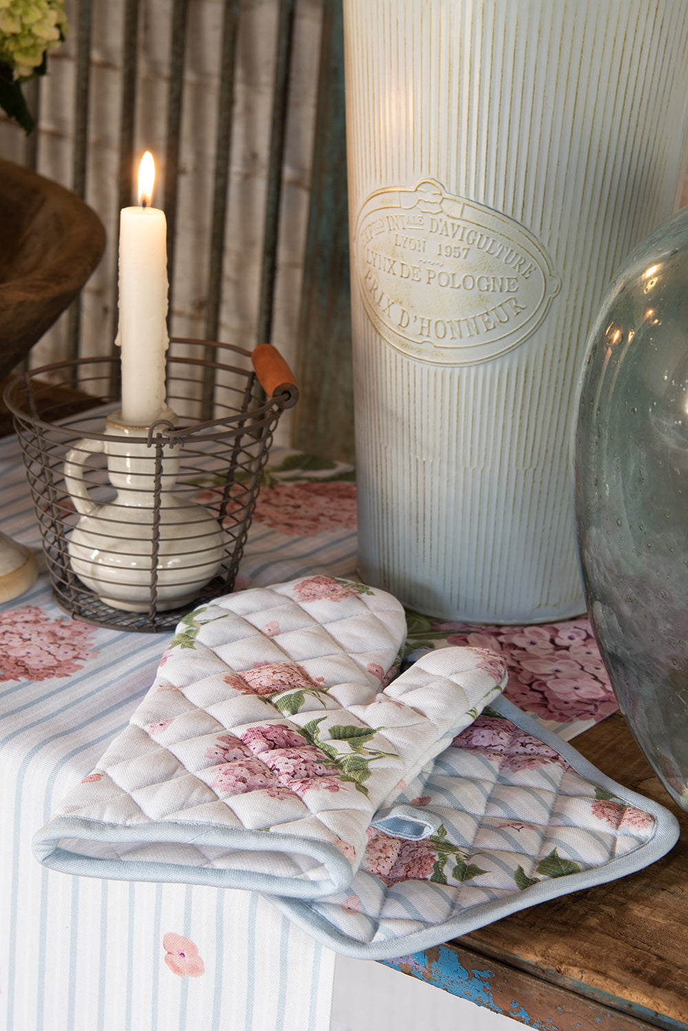Wie aan de zomer denkt, denkt aan bloeiende hortensia’s. Deze textielserie staat helemaal in het teken van deze zomerse bloem. De licht blauwe ondergrond vormt een frisse basis en het streeppatroon geeft deze serie tevens een klassieke knipoog. Het patroon met hortensia’s in roze kleuraccenten steelt als een ware eyecatcher de show. Dit uitgebreide textiel is – naast de variant voor volwassenen - tevens voorzien van een keukenschort, pannenlap en ovenhandschoen voor kinderen. Ovenwant Ovenhandschoen