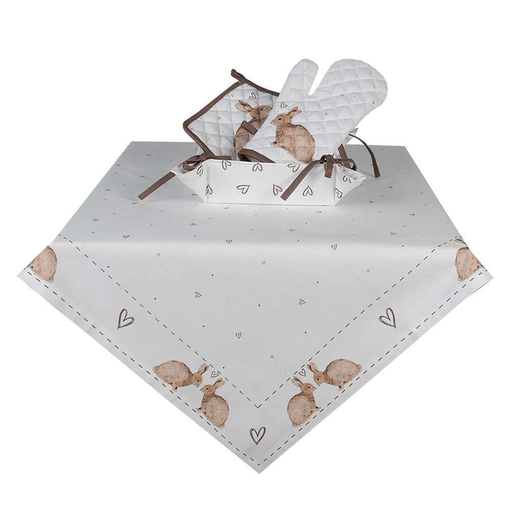 Als we aan Pasen denken, dan denken we aan de Paashaas. In deze textielserie staat twee schattige konijntjes centraal. Een neutrale serie die in elk interieur helemaal tot zijn recht zal komen. Het lieflijke hartjes patroon maakt van dit textiel een schattige serie die niet alleen tijdens de Paasdagen veel gezelligheid op tafel en in de keuken zal brengen, maar waar het hele jaar door van genoten kan worden. Met items als een tafelkleed, placemats, servetten en broodmandjes is een liefdevolle gedekte eettafel gegarandeerd. Ovenwant