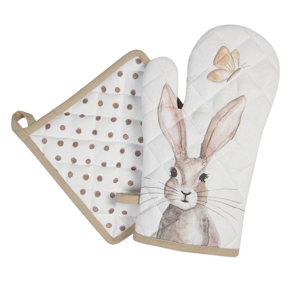 Clayre & Eef Ovenwant 18x30 cm Wit Bruin Katoen Konijn Ovenhandschoen