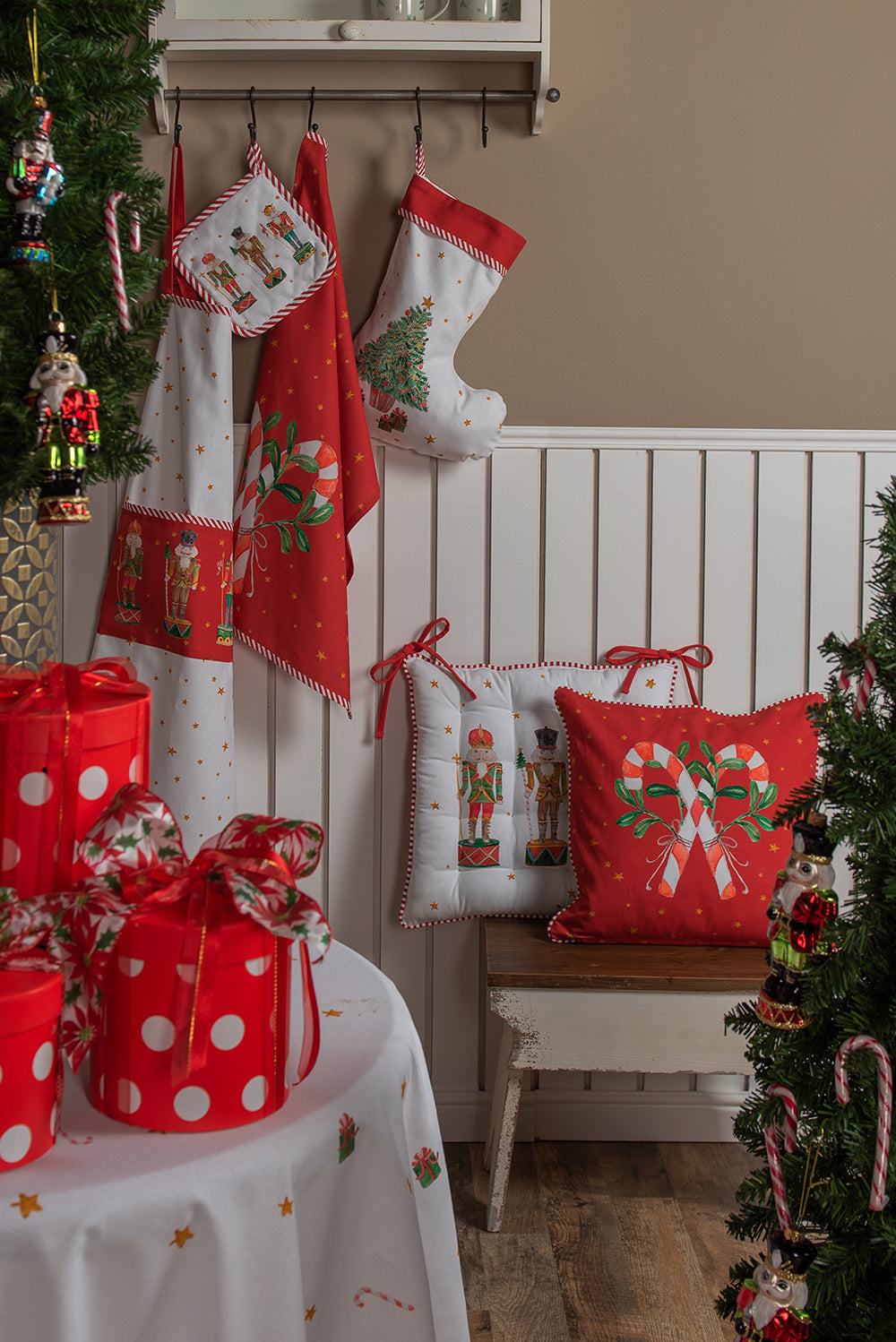 Met deze textielserie wordt Kerst gegarandeerd een gezellige en liefdevolle aangelegenheid. Deze prachtig vormgegeven serie is helemaal in stijl als je van de traditionele kerstsfeer houdt. De notenkrakers staan centraal in deze serie en de rode accenten maken het geheel helemaal af. Met items als tafellopers, servetten en placemats creëer je in een handomdraai Kerstsfeer op tafel. Het bijpassende servies is een mooie aanvulling op tafel maar zeker ook in de servieskast. Laat de Kerst maar komen! Pannenlap Afgiet Pannenlap
