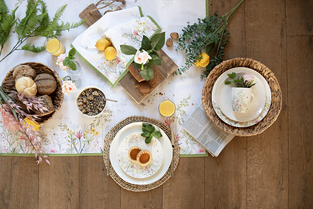 Deze textielserie is als een heerlijk frisse lentebries die door de lichte kleuren, vrolijke bloemen en witte ondergrond voor vele zonnige en vrolijke momenten aan tafel zal zorgen. Met deze kleine serie zijn de lentekriebels meteen voelbaar. Voor op tafel zijn er o.a. tafelkleden, tafellopers, placemats en servetten verkrijgbaar, maar ook in de keuken mag deze serie - met items al keukenschorten, keukendoeken, pannenlappen en ovenhandschoenen - zeker niet ontbreken. Het bijpassende servies creëert in een handomdraai een fijne sfeer in elke (woon)keuken. Servetten Katoen Set van 6