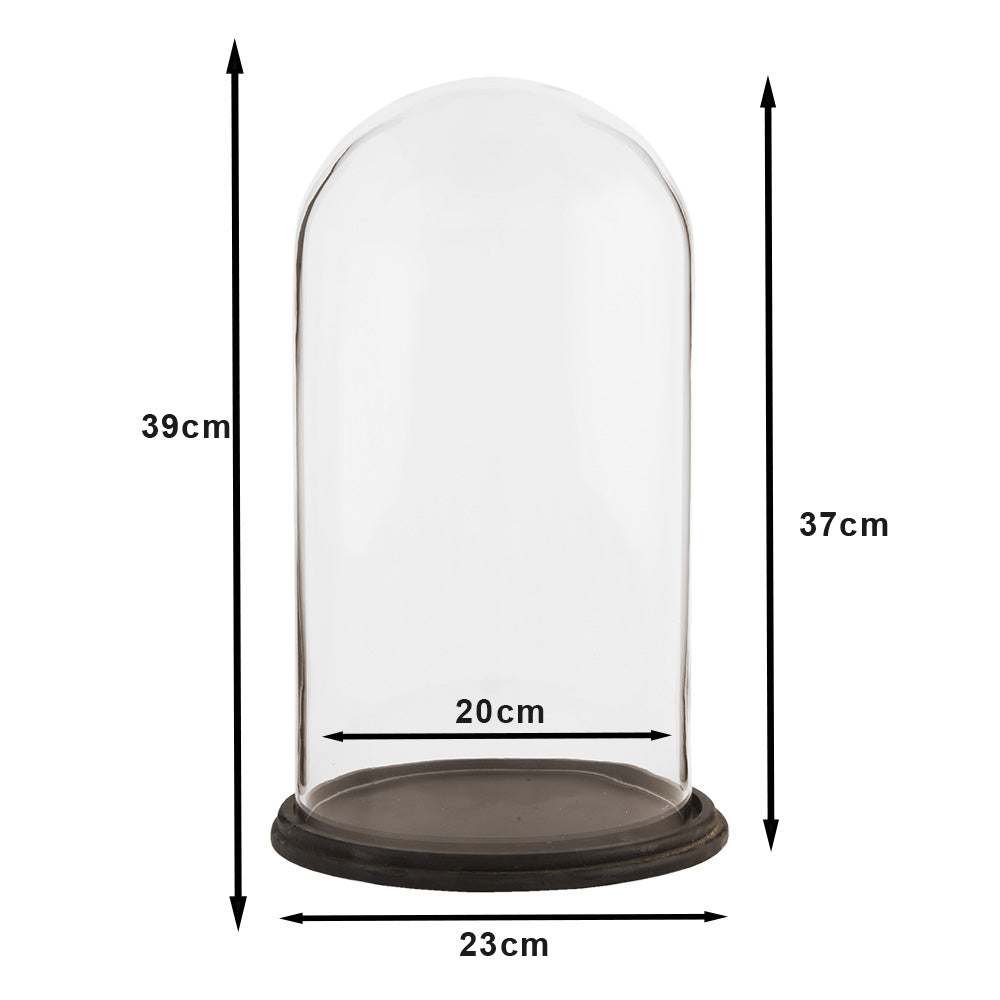 DECORATIEF GLAZEN STOLP: Onze glazen bel is 39 cm in hoogte (inclusief de basis) en heeft een totale basis diameter van 23 cm. De binnen diameter van het glas is 20 cm. De totale hoogte van het glas (exclusief basis) is 37 cm.