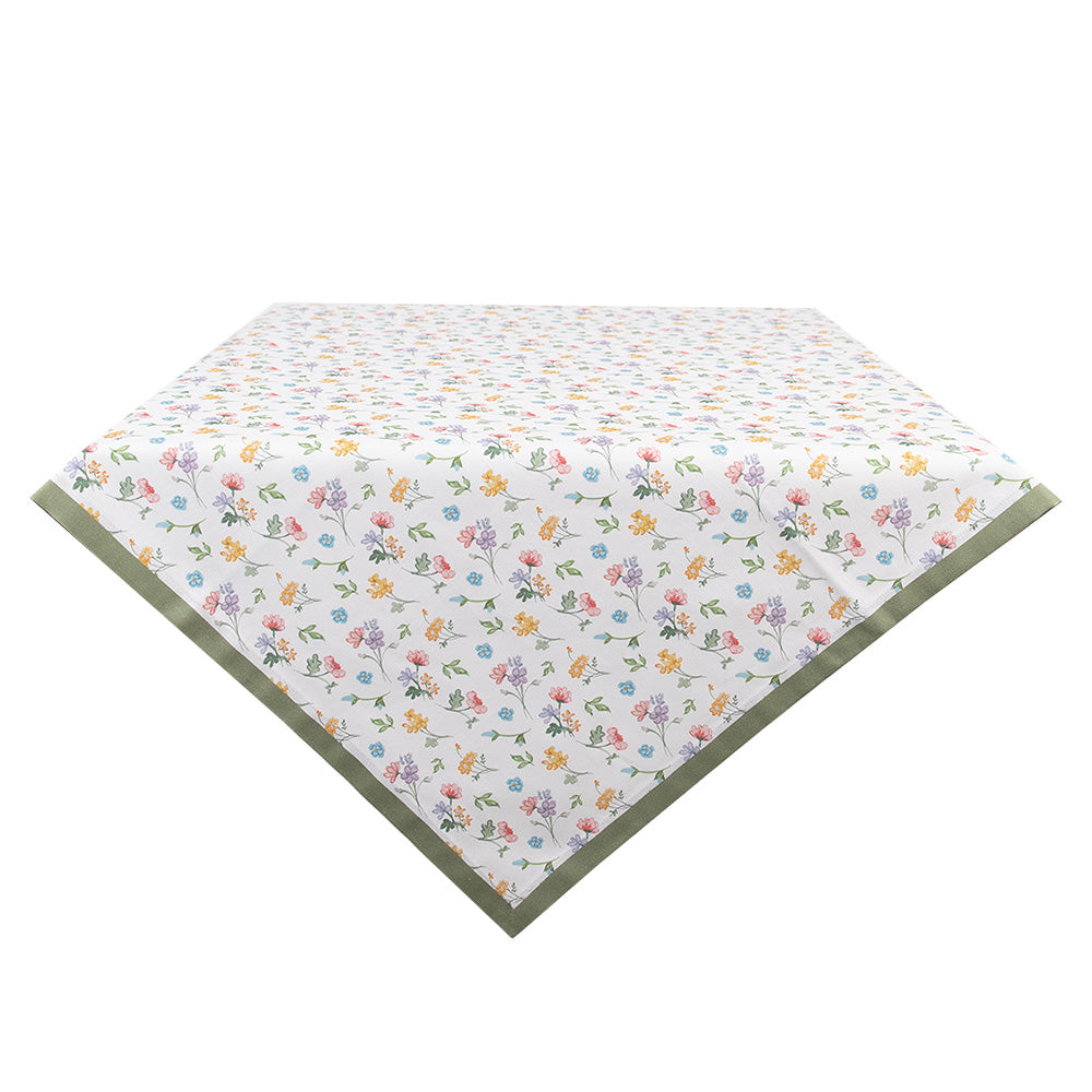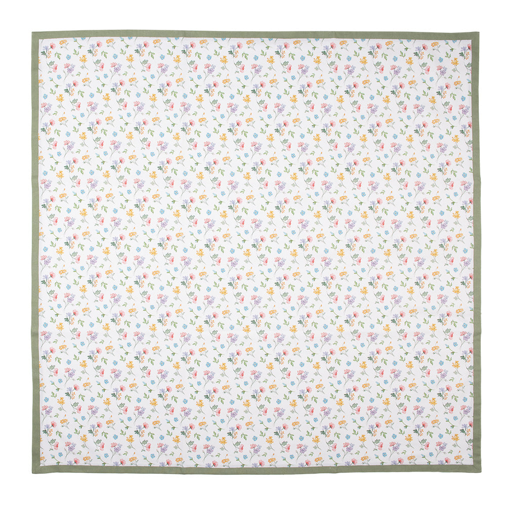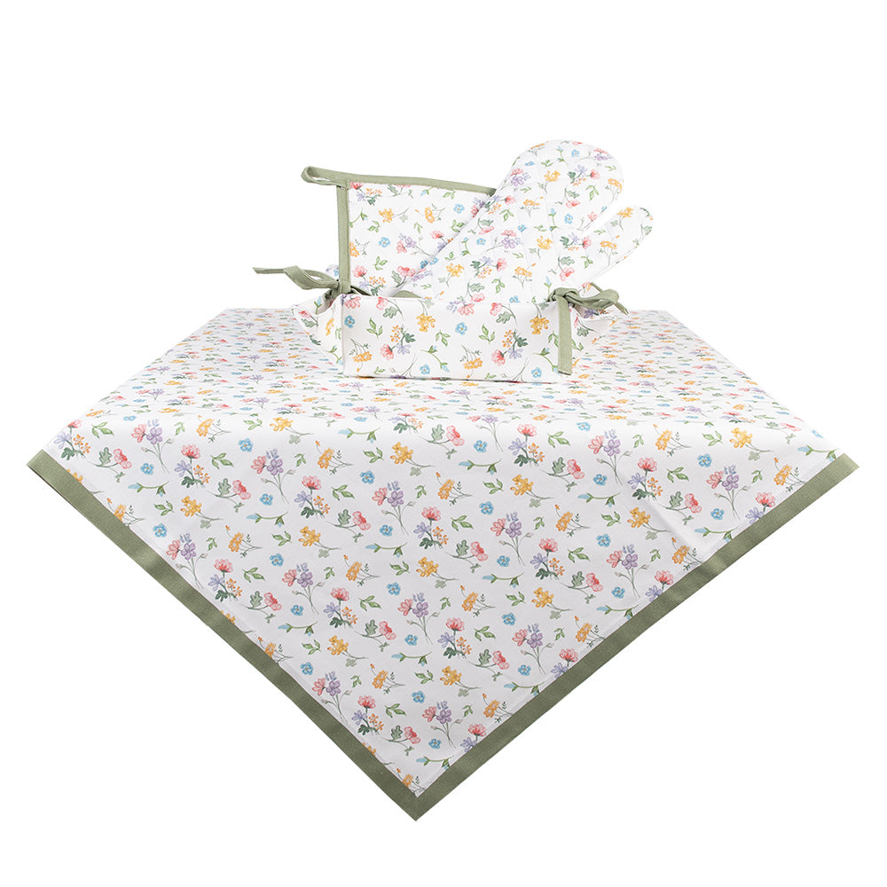 Deze ultiem vrolijke textielserie brengt de fauna bij je aan tafel èn in de keuken. Een frisse ondergrond zorgt voor een neutrale basis, waardoor het lieflijke bloemetjes patroon enorm goed tot zijn recht komt. De groene biezen zorgen voor een mooi contrast op items als het kussen, broodmandje en het keukenschort, maar ook op de keukendoek, pannenlap, ovenhandschoen en het tafelkleed. Ontdek deze snoezige collectie en haal het gehele jaar door de lente in huis. Spring vibes! Tafelkleed