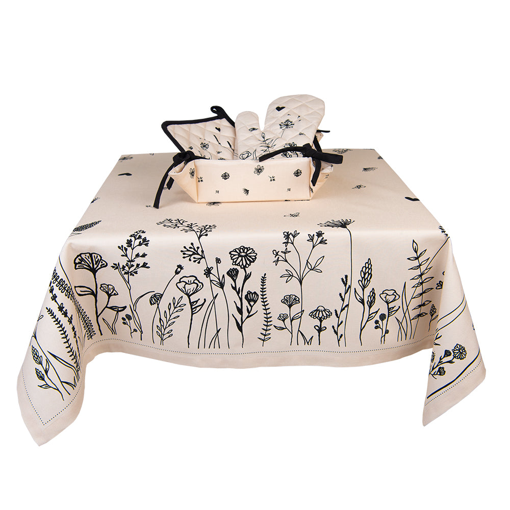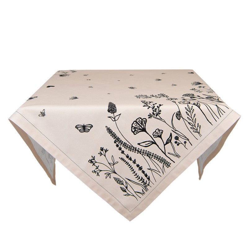 Beige tafelkleed met in het zwart een motief van bloemen en vlinders, van het merk Clayre & Eef.
