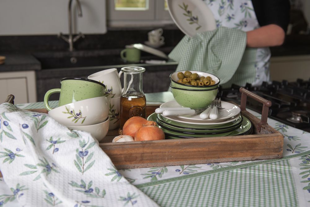 Denk je aan olijven, dan denk je aan mediterrane oorden. Een textielserie die zowel in een groene als blauwe variant verkrijgbaar is. De olijfranken geven deze serie hèt ultieme vakantiegevoel. Mooi vormgegeven tafelkleden en tafellopers creëren op tafel een fijne sfeer die compleet gemaakt kan worden met bijpassend servies. Het fraai vormgegeven keukentextiel met items als keukenschorten, pannenlappen en keukendoeken maken ook de keuken tot een waar kookparadijs.