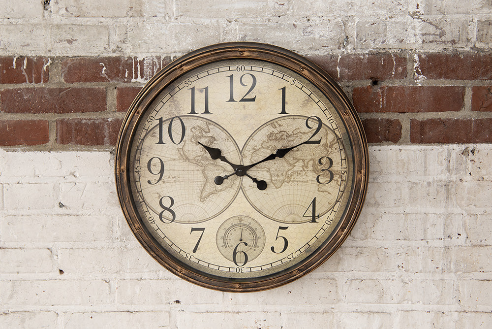 Decoratieve bruin met beige wandklok, gemaakt van kunststof en glas, in een landelijke stijl. Wijzerplaat met afbeelding wereldkaart. Van het merk Clayre & Eef. Werkt op 1xAA batterij (niet inbegrepen). Eenvoudig op te hangen met 1 schroef.