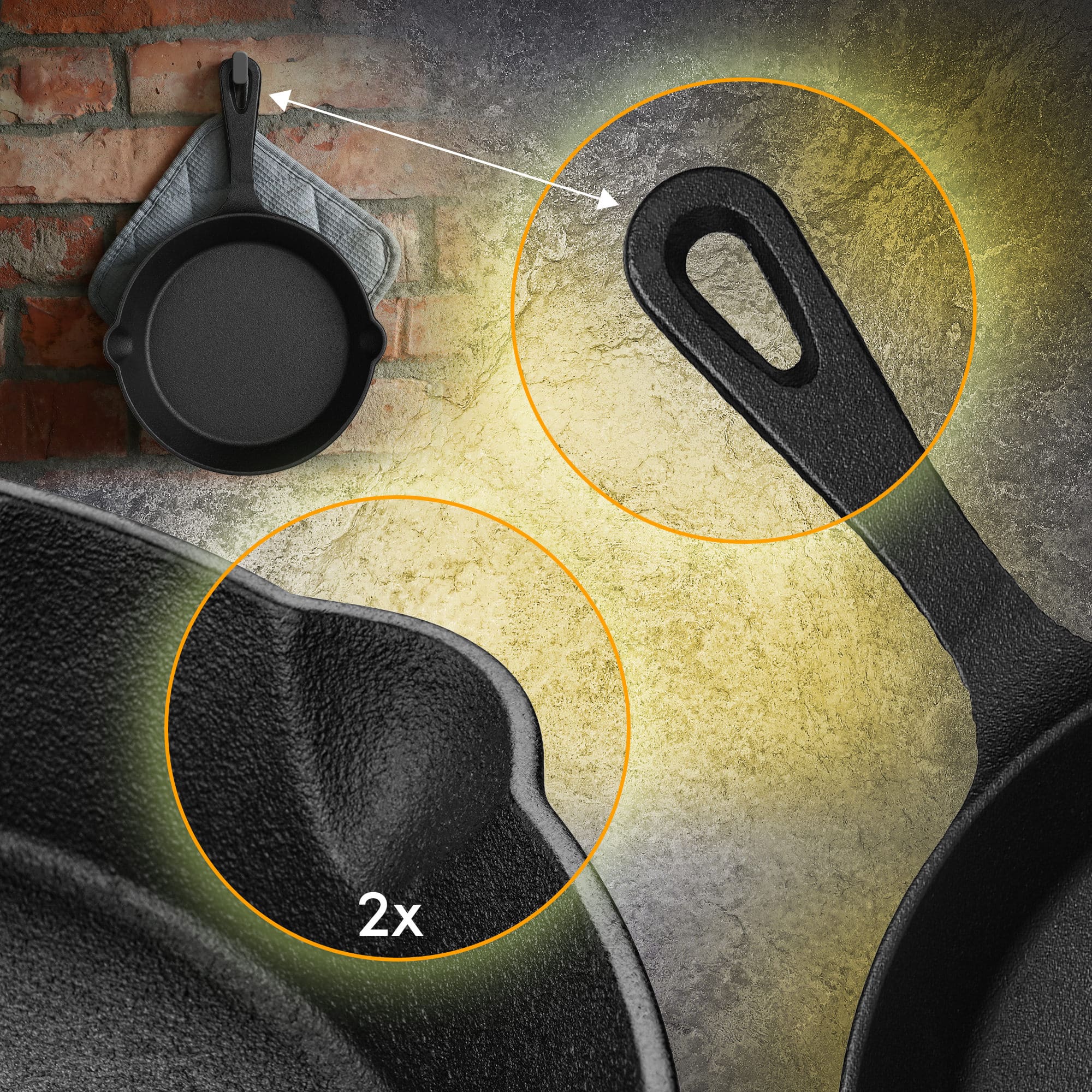 Gietijzer is bijzonder hittebestendig en de temperatuur wordt gelijkmatig verdeeld en gedurende lange tijd gehandhaafd. Tegelijkertijd is het materiaal uitzonderlijk robuust en vervormt het niet. De twee schenkhulpen die aan elke pan zijn bevestigd en de handgrepen zorgen voor een gemakkelijke hantering.