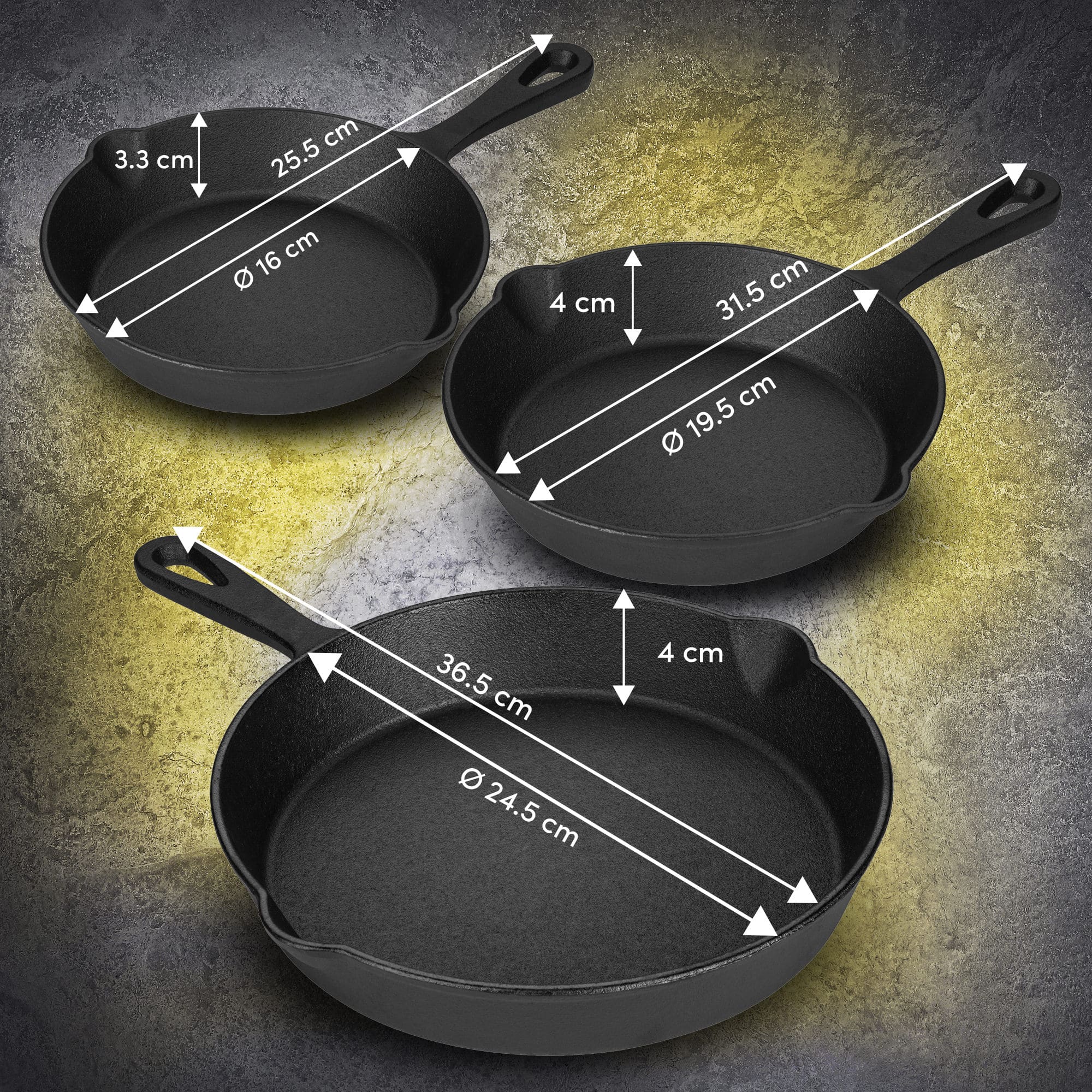 De set van CLP wordt geleverd met drie gietijzeren pannen van verschillende afmetingen, zodat u ideaal bent uitgerust voor verschillende gelegenheden.