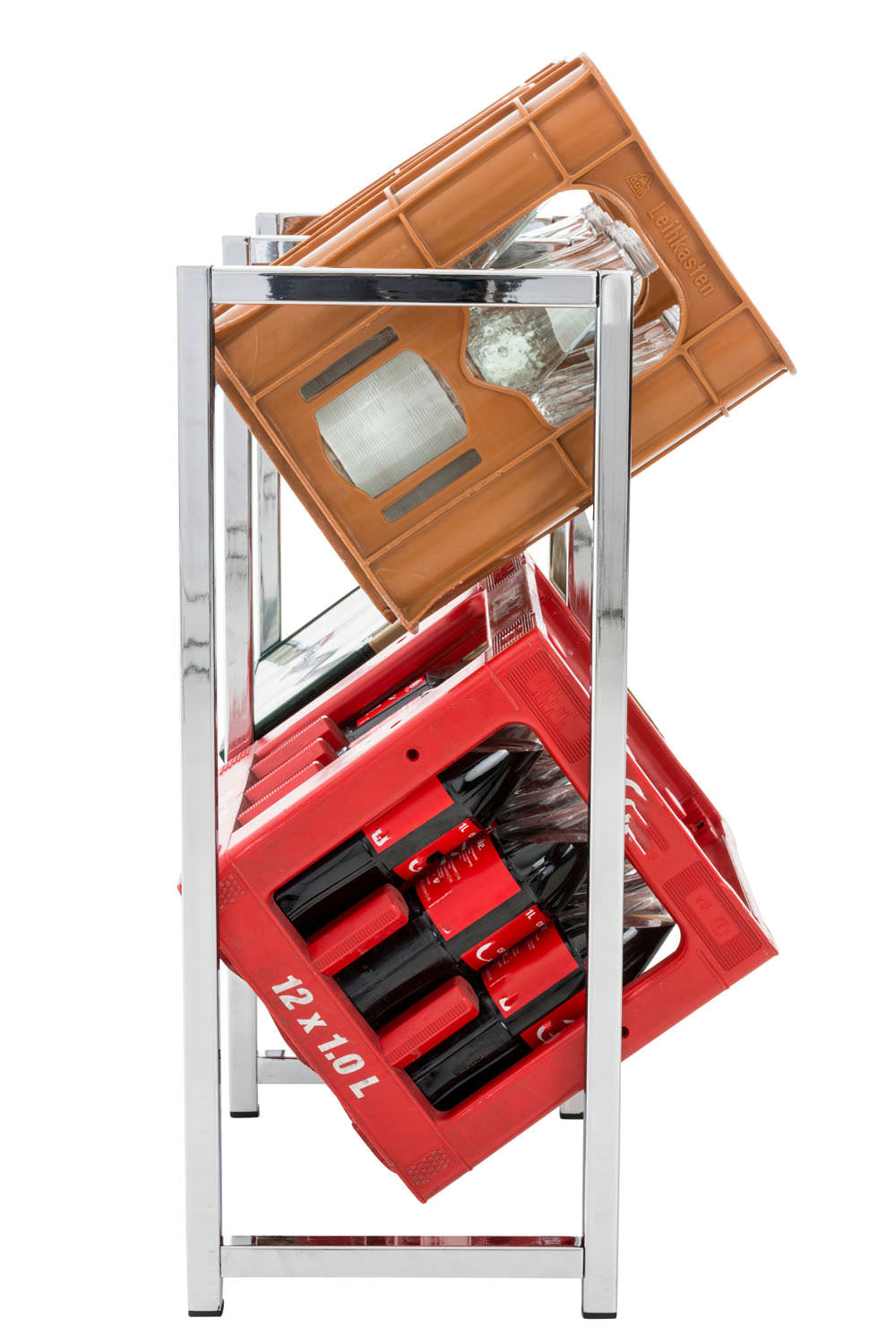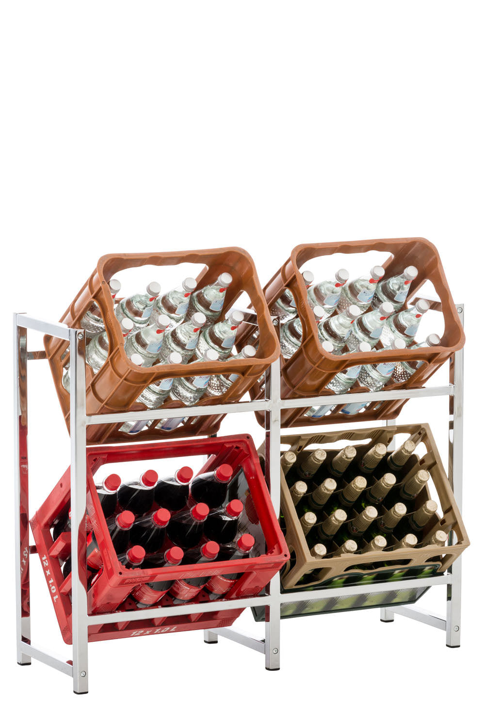 Dit krattenrek mag gezien worden. Het is niet enkel praktisch, maar ook echte een blikvanger door het roestvrije staal. Door de schuine positie van de drankkratten kunnen de flessen gemakkelijk uitgenomen worden. Ook andere kratten kunnen in het rek opgeborgen worden, bv. een houtkrat.