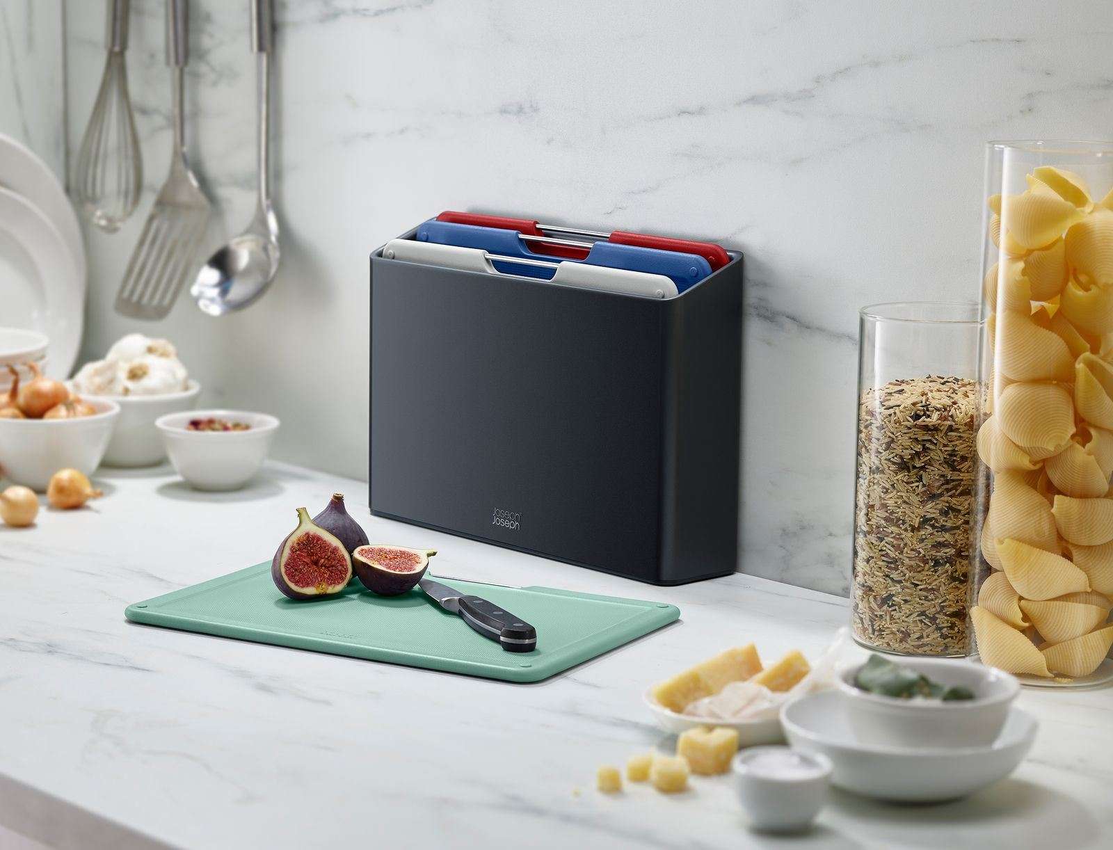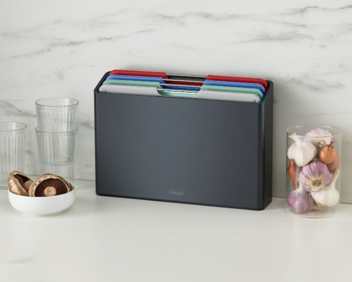 Een set goede snijplanken is onmisbaar in iedere keuken. Met deze Folio snijplanken set van Joseph Joseph heb je al je benodigde planken makkelijk en goed georganiseerd bij elkaar. De handige behuizing waar je de snijplanken in kunt bewaren zorgen voor een echt statement op het aanrecht. De snijplanken zijn kleur gecodeerd waardoor je verschillende soorten voedsel makkelijk van elkaar gescheiden kunt houden om kruisbesmetting te voorkomen. Het snijvlak is verder mesvriendelijk, BPA vrij en voorzien van anti-slip voetjes. Na gebruik mogen de snijplanken in de vaatwasser worden schoongemaakt.