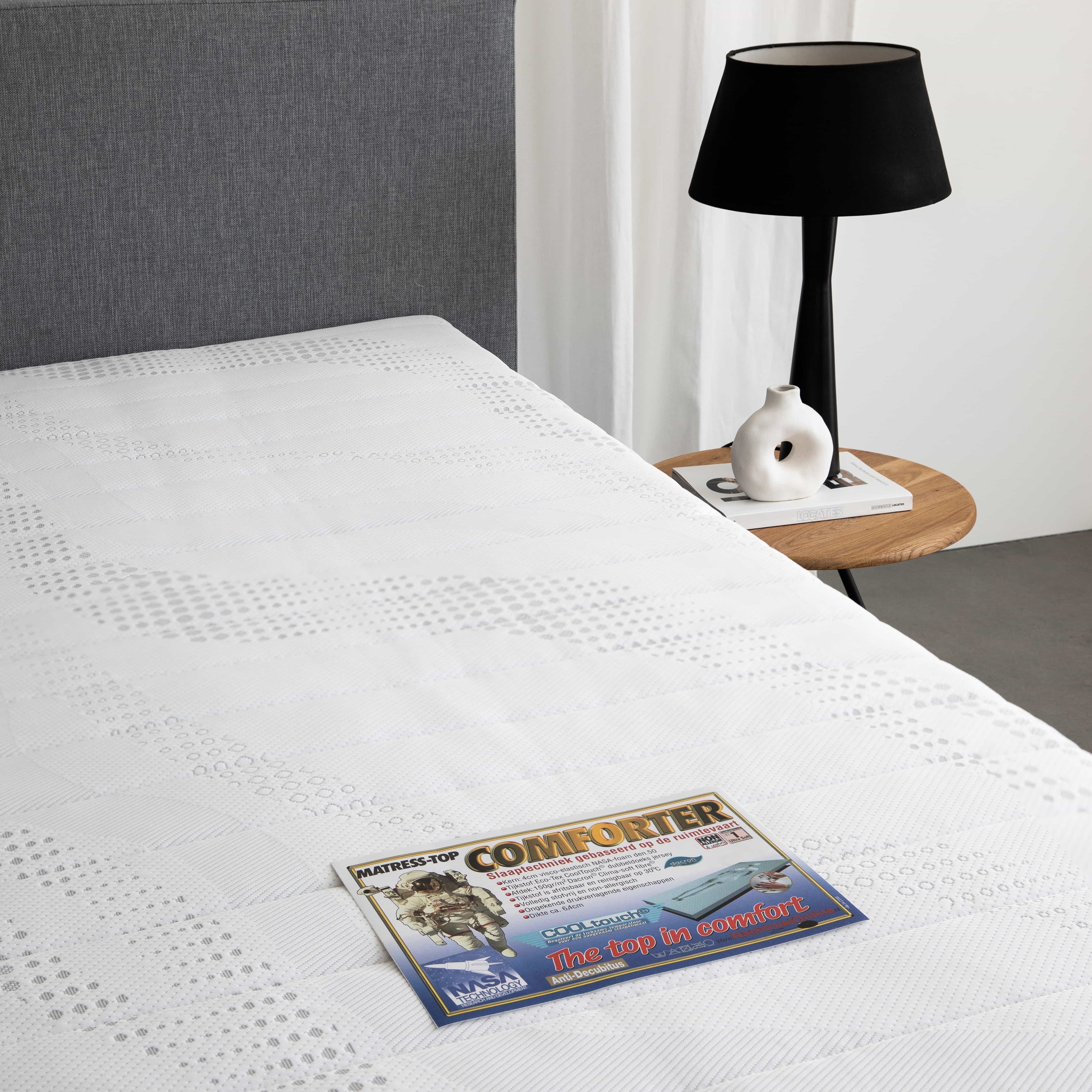 De NASA Comforter® topper is bekleed met een speciale CoolTouch dubbeldoeks jersey tijkstof. CoolTouch is temperatuur regulerend en stimuleert de ventilatie. Dit maakt de Comforter in elk seizoen een heerlijke topper. Men ondervindt door de Cooltouch technologie in de tijkstof 'n aangenaam en zachter slaapklimaat. De speciale tijkstof is voorzien van een ritssluiting aan 3 zijden, waardoor deze gemakkelijk afneembaar en wasbaar is.