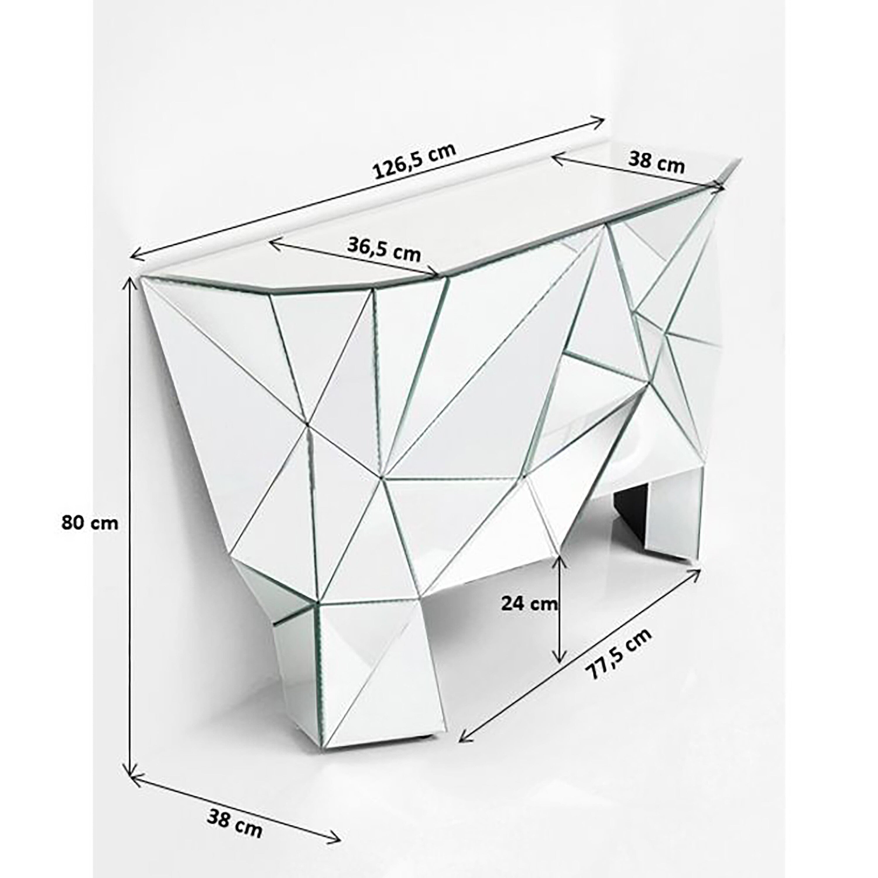 Deze designconsole is bedekt met meerdere spiegels voor een avant-gardistische look. Hij maakt indruk met zijn ongestructureerde montage. De spiegeloppervlakken zijn gerangschikt als prisma's en weerkaatsen gekleurd licht.
