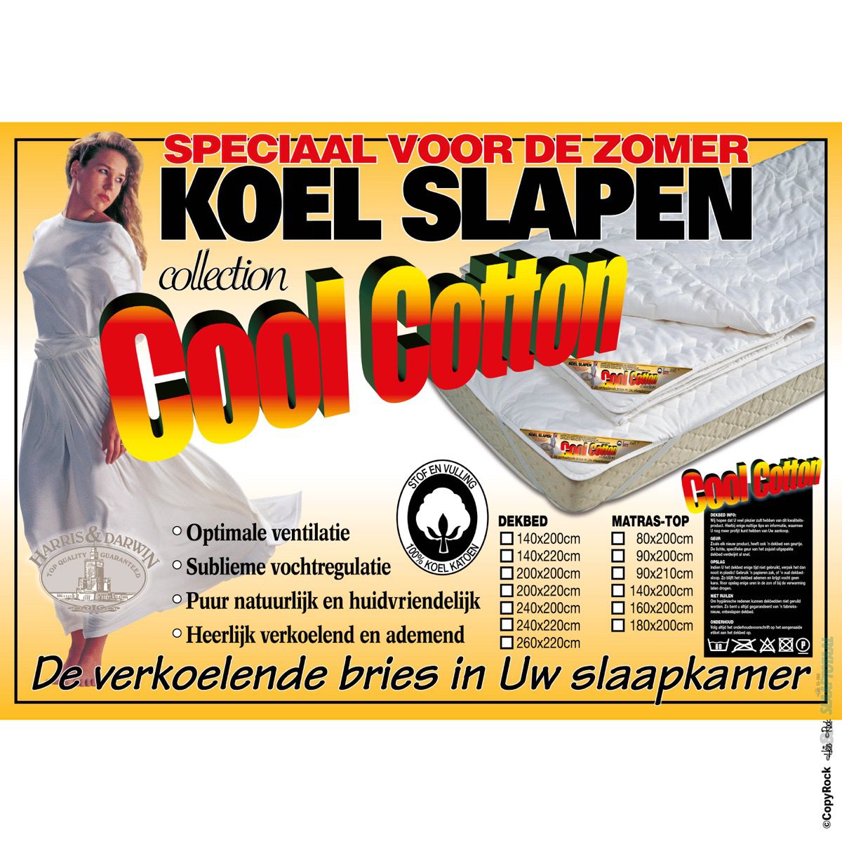 De natuurlijke koele bries in uw slaapkamer! Met Cool Cotton haalt U op een natuurlijke wijze extra ademend vermogen en slaapcomfort voor de zomer in huis. Bij de slaapspecialisten van Cool Cotton staat de wonderlijke werkingen van natuurlijk katoen centraal. Licht en luxueus zorgen voor extra ventilerend en door ademend beddengoed. U herkent de gele dekbed draagtassen van Cool Cotton vast. Al biedt Cool Cotton niet enkel flinterdunne zomerdekbbedden maar kunt u Cool Cotton ook kennen van extra koele ondersteunende hoofdkussen, slopen, matrastoppers en puur natuurlijk ademend bedlinnen. Niet meer dwaaien, woelen en zweten is het bekende motto van Cool Cotton tijdens de warme klamme zomernachten.