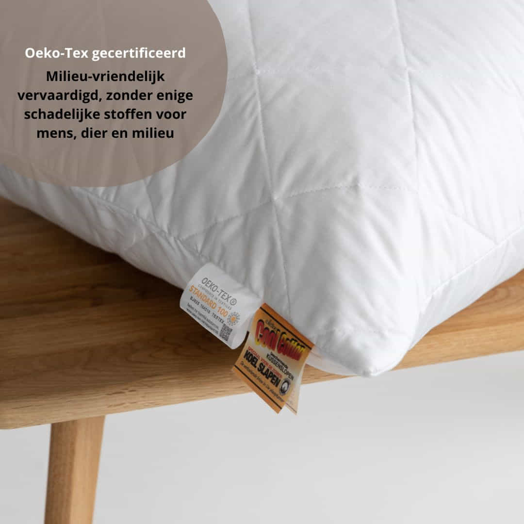Cool Cotton hoofdkussen zijn voorzien van een gecertificeerd Oeko-Tex label. Het internationale Oeko-Tex waarborg garandeert dat de bekledingsstoffen en vullingen volledig milieuvriendelijk zijn vervaardigd, zonder enige schadelijke stoffen voor mens, dier en milieu.