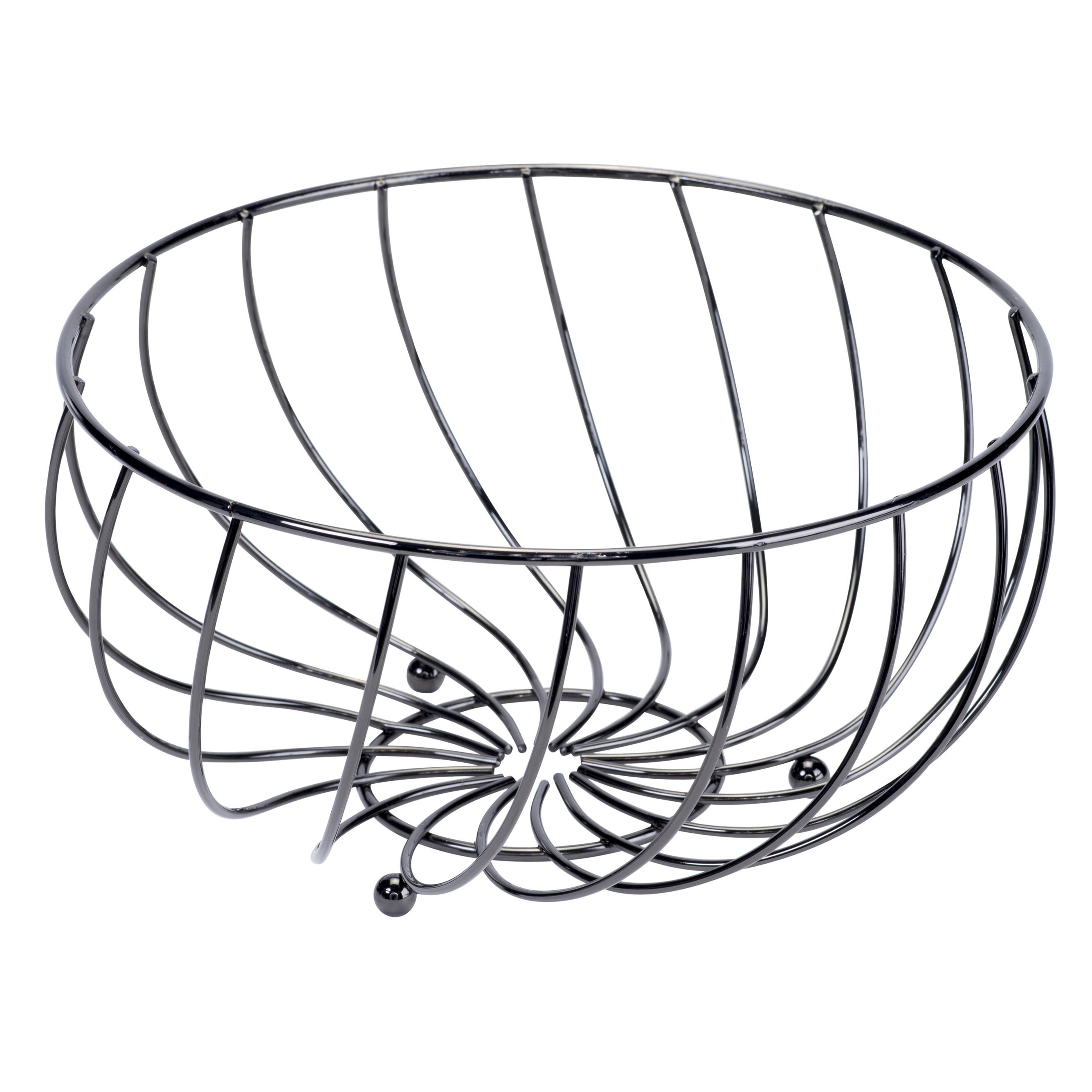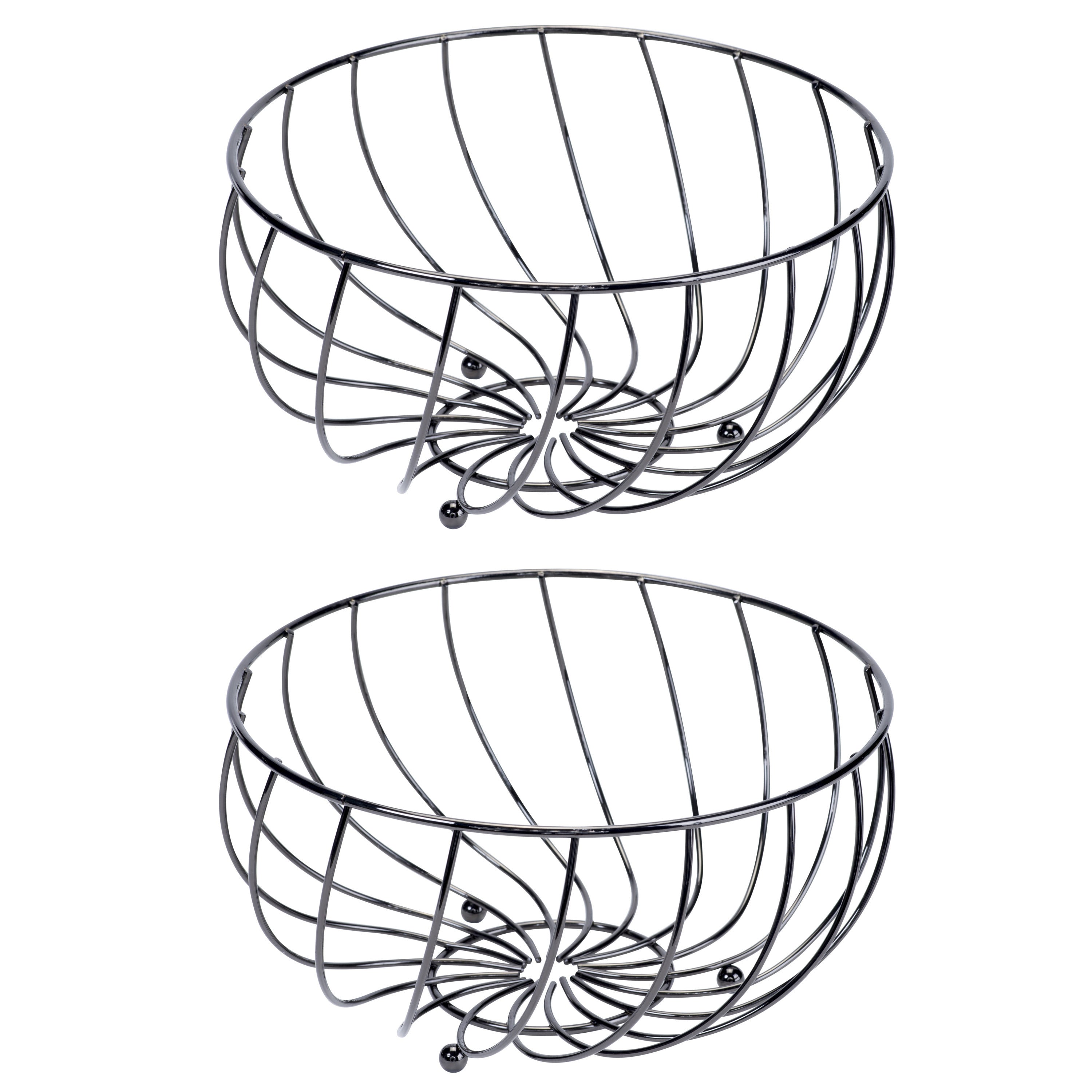 Metalen fruitmand zwart rond 28 x 14 cm. De open rand/wand zorgt voor een constante luchtcirculatie waardoor het fruit minder snel overrijp is. Materiaal: metaal. Reinigen: afnemen met een vochtige doek.