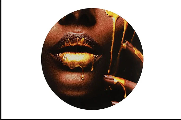 Versier je huis met een prachtig glasschilderij. Dit glasschilderij is maar liefst 50 bij 50 cm groot. De print is in kleur en op de afbeelding is een gezicht met gouden lippen, gouden verf langs de wangen en goud op de vingers geïllustreerd. Foto op plexiglas - Glasschilderij - plexiglas schilderij gouden lippen - 50x50 cm.