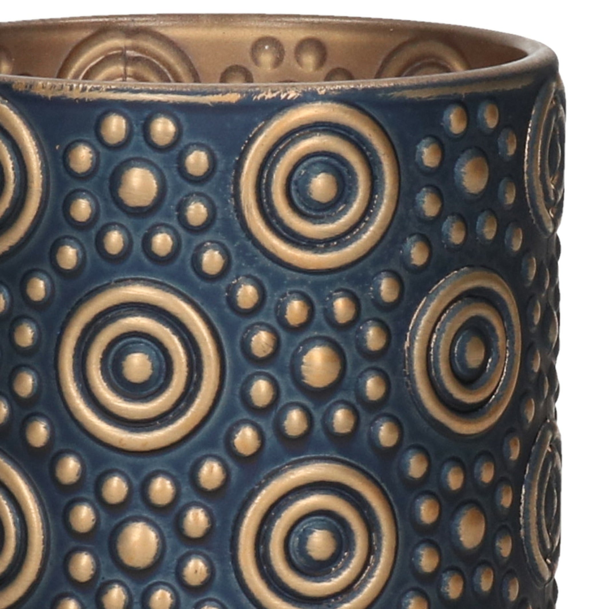 Luxe theelichthouder of kaarsenhouder voor waxinelichtjes van licht doorschijnend relief glas in de kleuren nachtblauw/goud. Afmetingen: D7 x H8 cm. Plaats meerdere formaten en of meerdere stuks van deze serie bij elkaar op een kaarsenbord voor een maximale en stijlvolle sfeer. Serie: Fantasy.