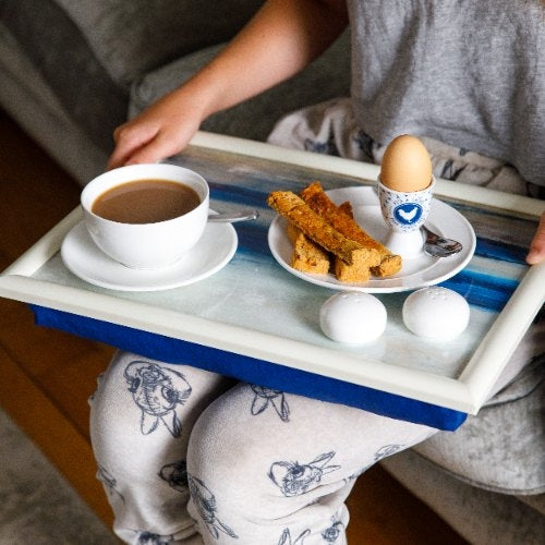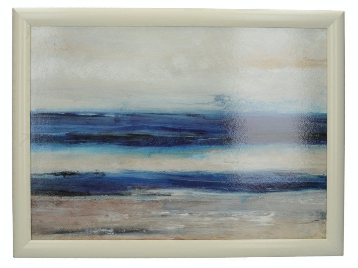 Een laptray noemen we vaak ook wel schoot dienblad, schootkussen of schoottafel. Ze zijn ideaal wanneer je activiteiten wilt gaan doen waar je een tafel voor nodig hebt terwijl je eigenlijk liever comfortabel op de bank wilt blijven zitten. Een laptopsessie of het nuttigen van een maaltijd zijn hiervan goede voorbeelden. De laptray van Creative Tops heeft een afmeting van 44 x 34 x 6.5 cm en heeft een stevige bovenkant van hout waar je al je benodigde dingen op kunt zetten. De onderkant van de tray is voorzien van een zak met balletjes welke je het beste kunt vergelijken met een zitzak. Dit is comfortabel voor je knieën en zorgt ervoor dat de tray perfect in balans blijft. In het abstract blauwe patroon vind je zand kleuren, diep blauwe kleuren en zwarte schaduwen waardoor de illusie gevormd wordt dat je vanaf het strand naar een oceaan kijkt.