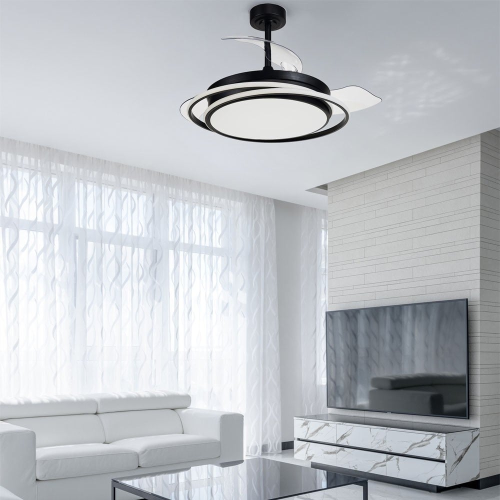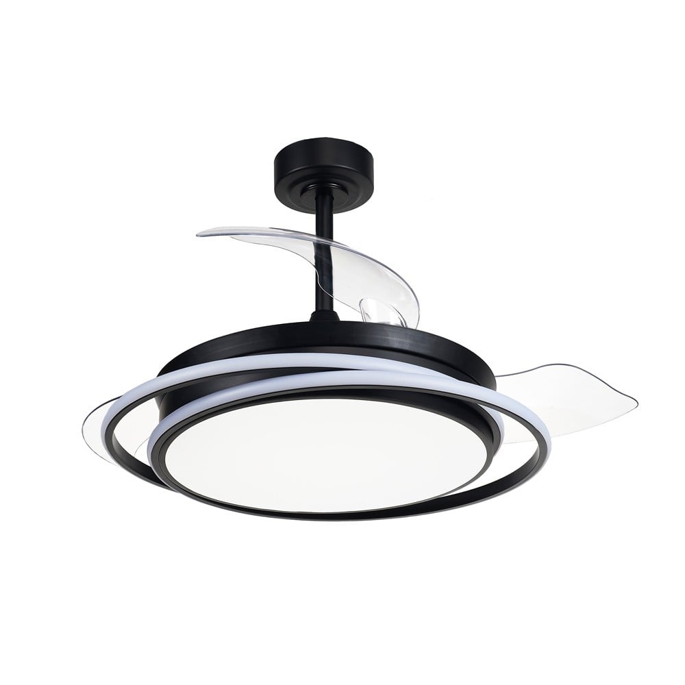 Deze plafondventilator heeft 3 slimme bladen die automatisch uitklappen wanneer hij wordt ingeschakeld en inklappen wanneer hij wordt uitgeschakeld, waardoor hij transformeert tot een moderne hanglamp. Wanneer de bladen zijn ingeklapt, heeft de lamp een diameter van 58 cm en een hoogte van 50,5 cm vanaf het plafond tot de onderkant van de ventilator. Met de bladen uitgeklapt is de totale diameter 106 cm. Eventueel is het ook mogelijk om de extra meegeleverde kortere stang gebruiken, dan wordt de totale hoogte 38 cm. De ventilator is zwart met transparante kunststof bladen.