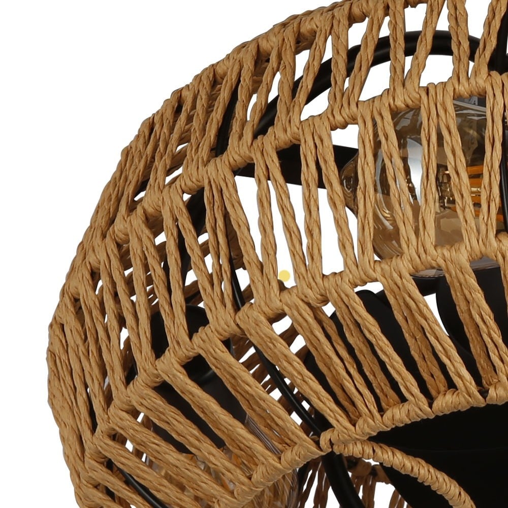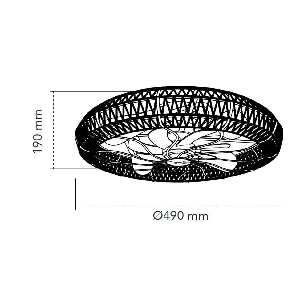 De diameter van deze ventilator is 49 cm en de totale hoogte is 19 cm. Hij is vervaardigd uit metaal en touw in een combinatie van zwart met beige touw. Let op: de 4x E27 lichtbronnen zijn niet inbegrepen.