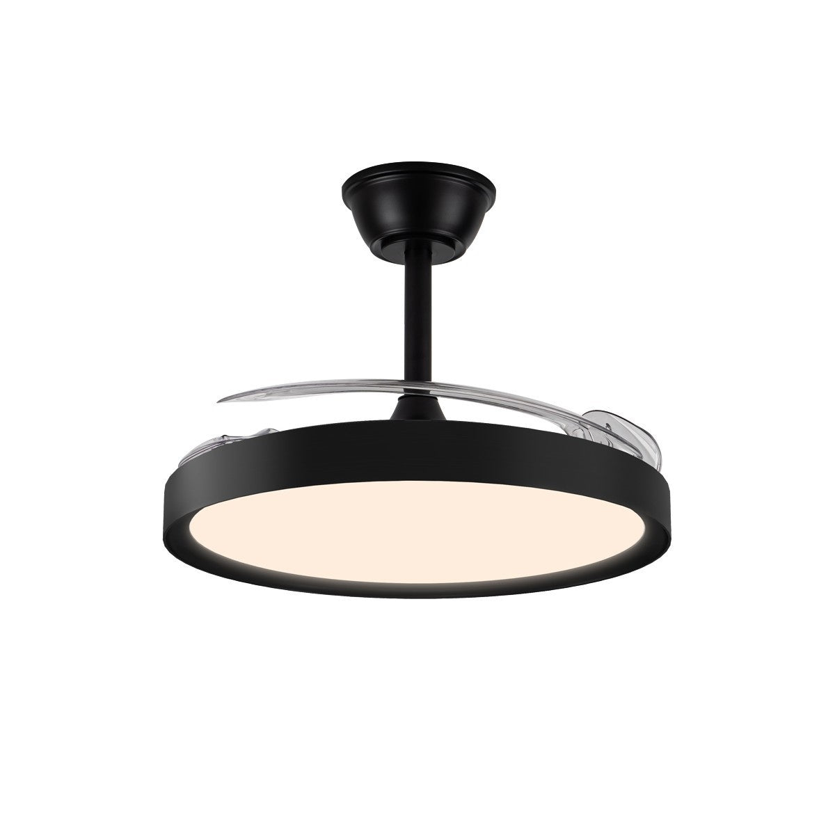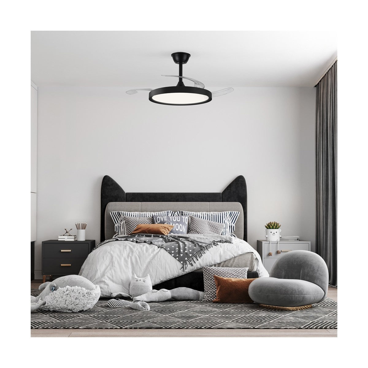 Deze strakke plafondventilator is voorzien van slimme bladen die automatisch uitvouwen bij het inschakelen en inklappen bij het uitschakelen, waardoor hij transformeert naar een moderne hanglamp. In de ingeklapte stand heeft de lamp een diameter van 48,5 cm en hangt deze 42 cm vanaf het plafond tot aan de onderkant van de ventilator. Met de bladen uitgevouwen bereikt de totale diameter 106 cm. Indien gewenst kan een kortere stang worden gebruikt, waardoor de totale hoogte 32 cm wordt. De ventilator heeft een zwarte behuizing met transparante kunststof bladen.