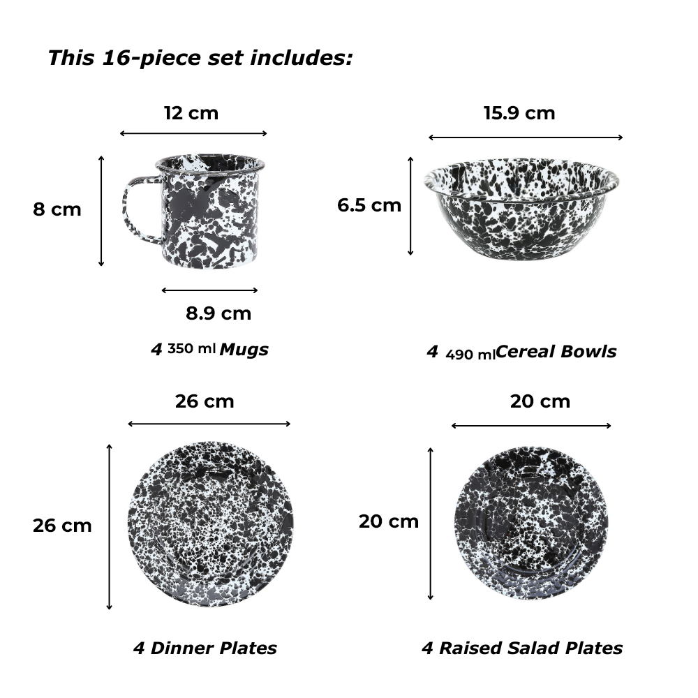 De set bestaat uit 16 hoogwaardige onderdelen: vier dinerborden, vier saladeborden, vier kommen en vier mokken. Gemaakt van duurzaam geëmailleerd staal, is dit servies bestand tegen dagelijks gebruik en geschikt voor zowel binnen- als buitengebruik.