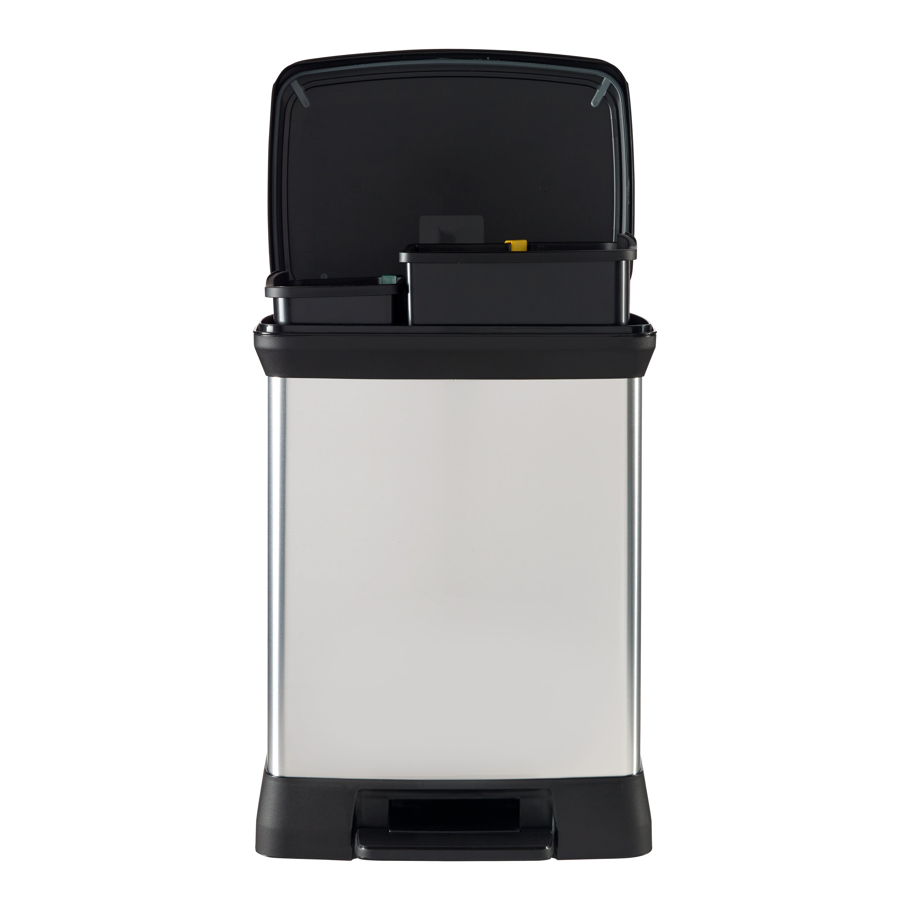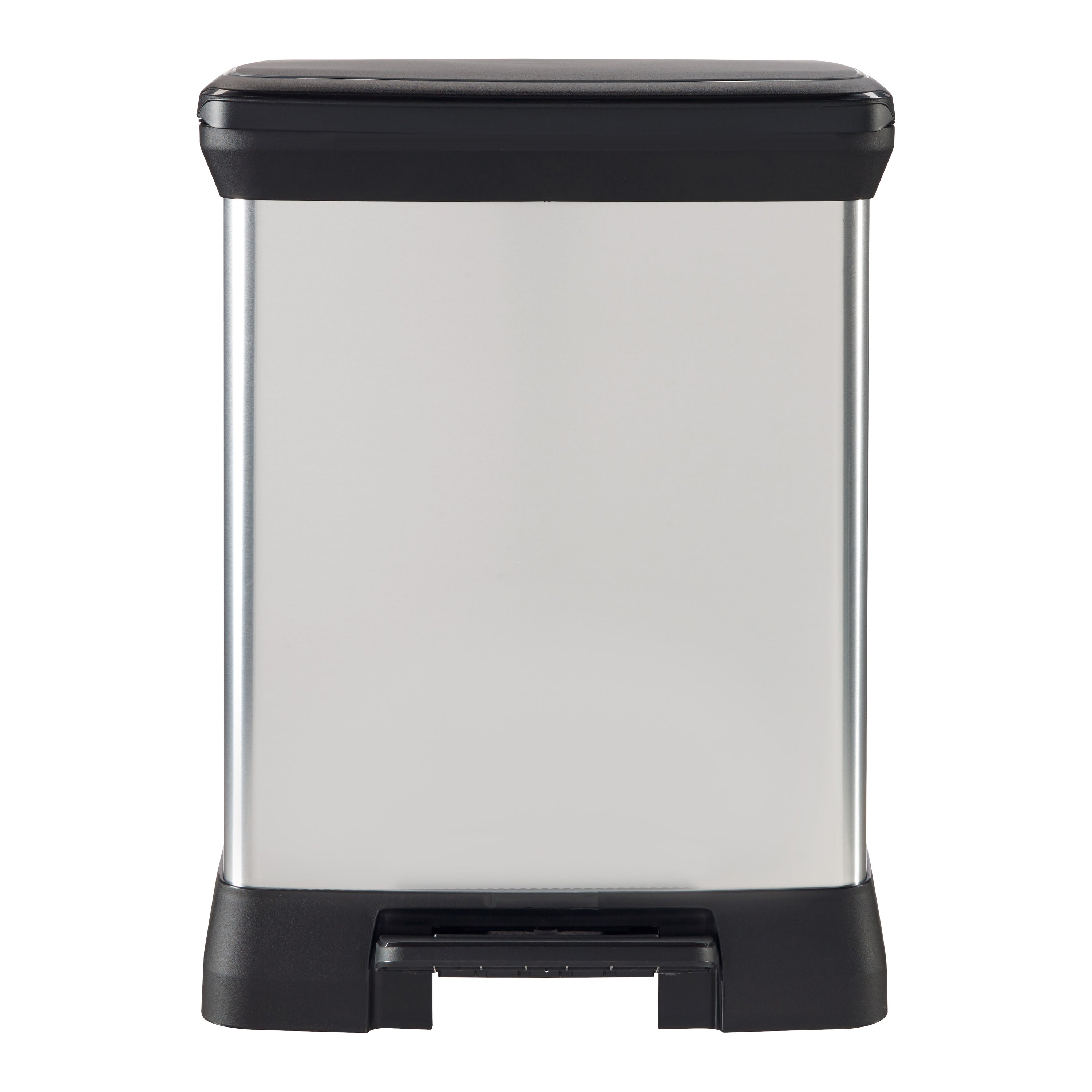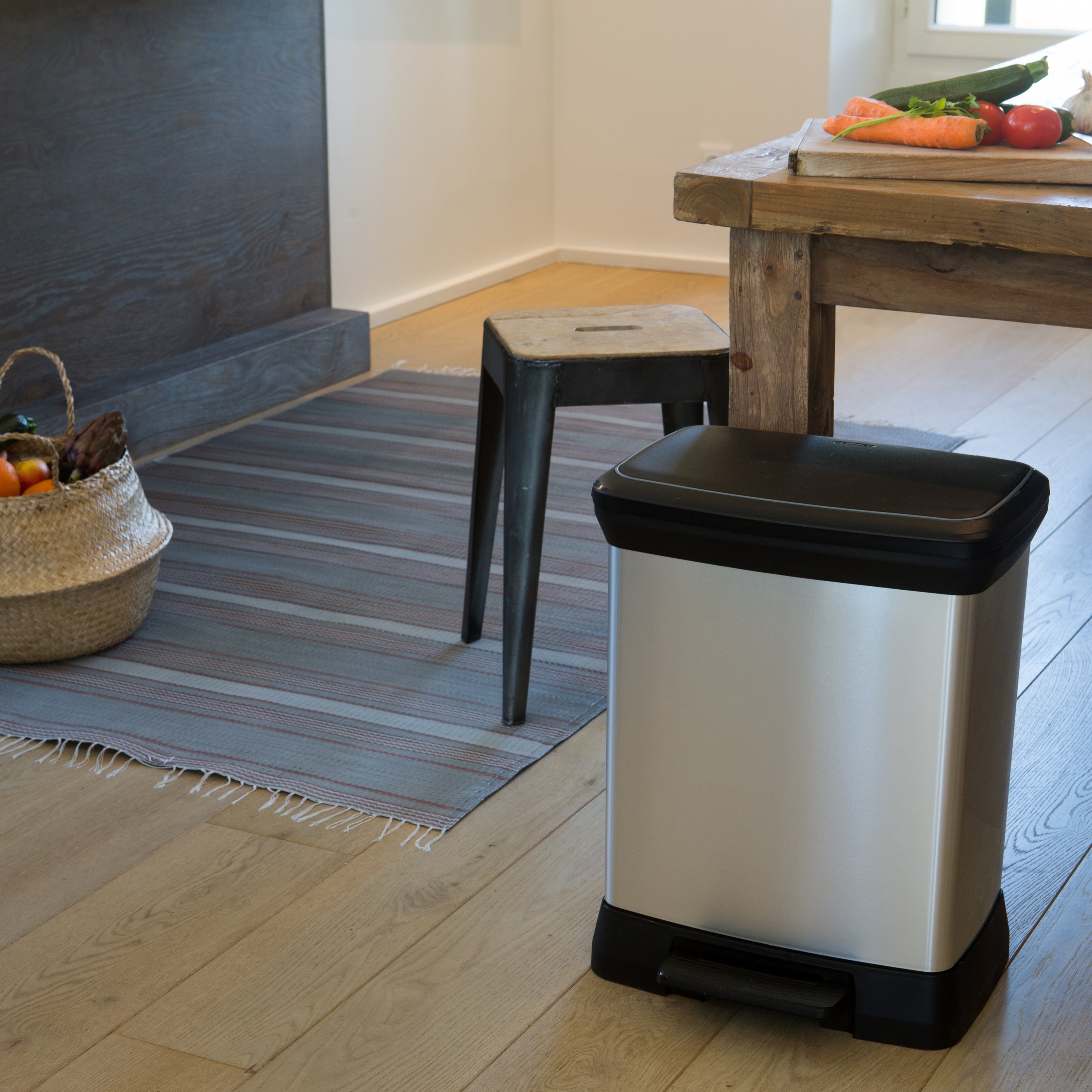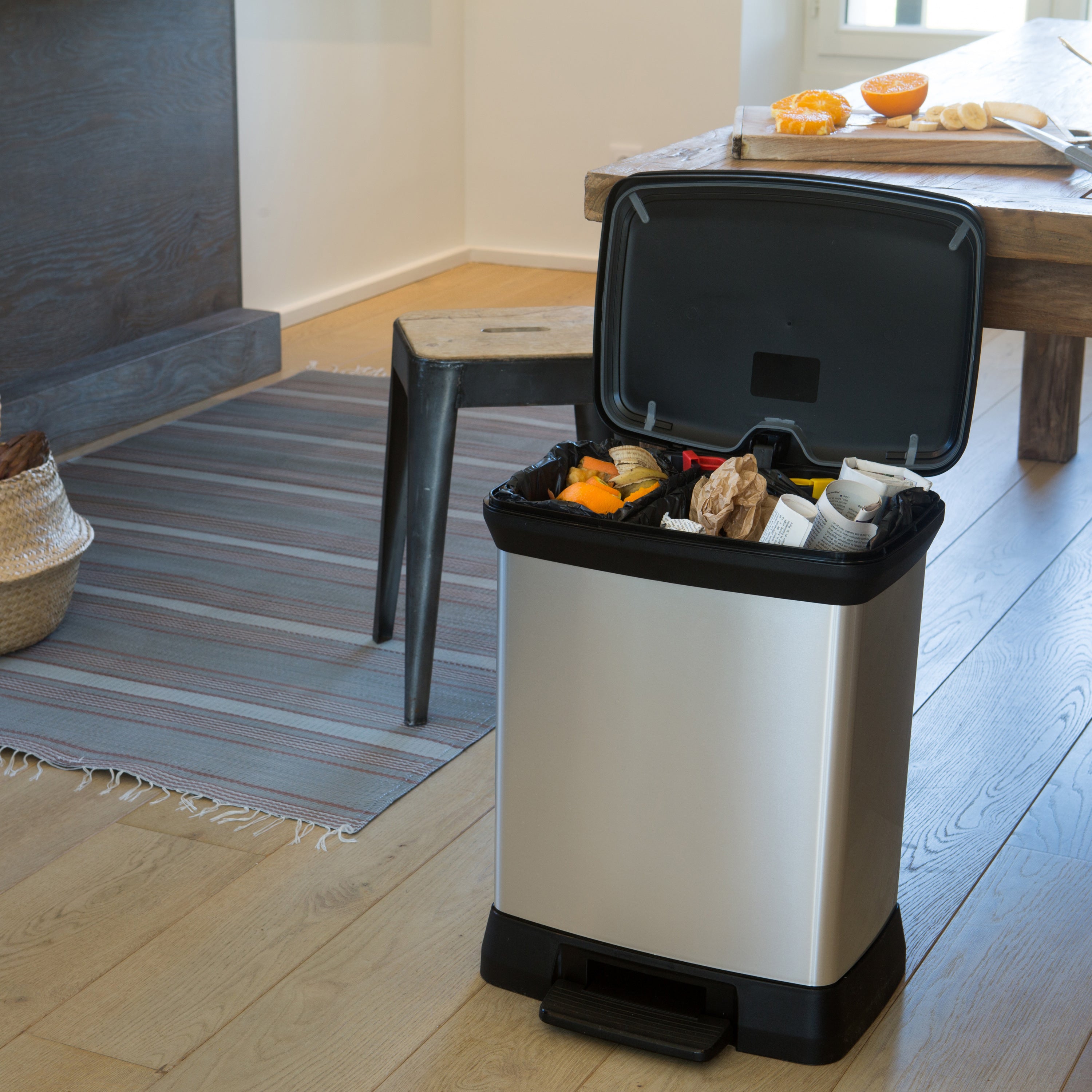 Voor een beter milieu De Duo Decobin pedaalemmer van Curver heeft een totale inhoud van 30 liter en is voorzien van twee binnenbakken; één van 10 liter en één van 18 liter. Dit maakt de afvalemmer perfect voor het scheiden van afval. De Decobin is te openen en te sluiten door middel van het stevige pedaal. De afvalemmer is voorzien van speciale hendels aan de binnenzijde van de bakken, waar je de afvalzak eenvoudig aan bevestigt. Hierdoor blijft de afvalzak goed zitten en zakt hij niet weg wanneer hij wat voller is.