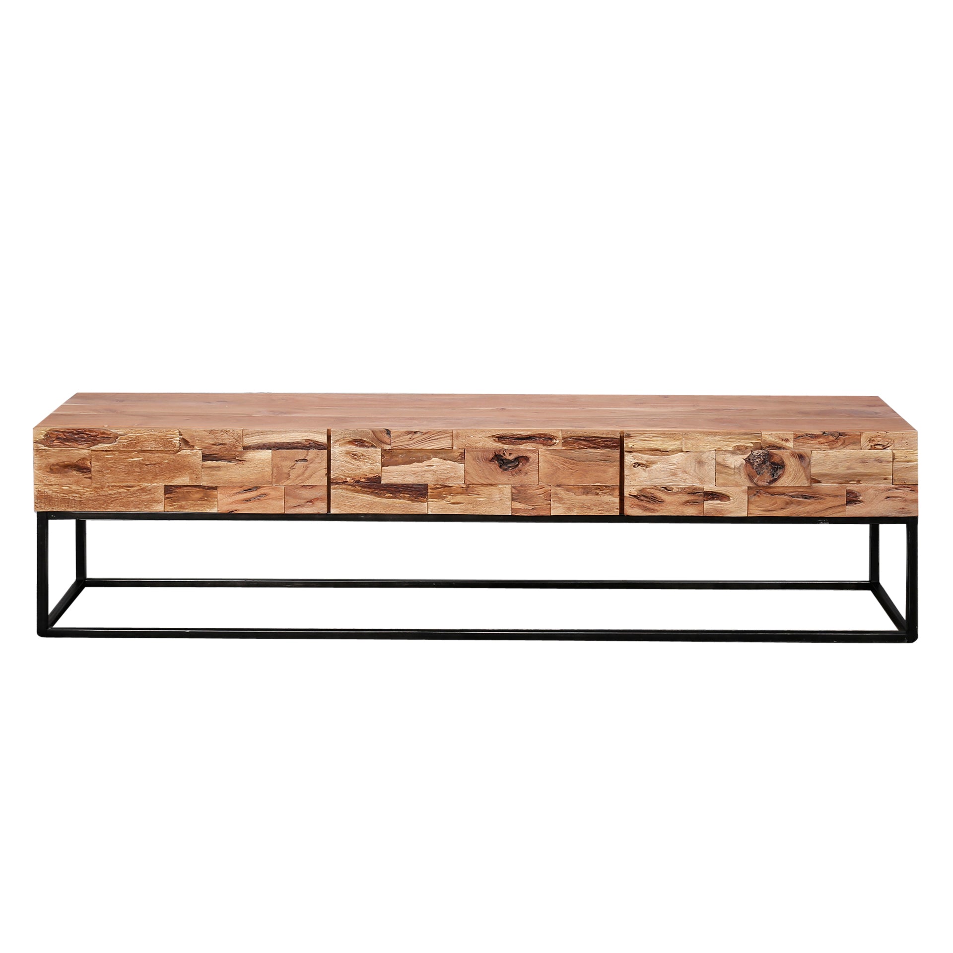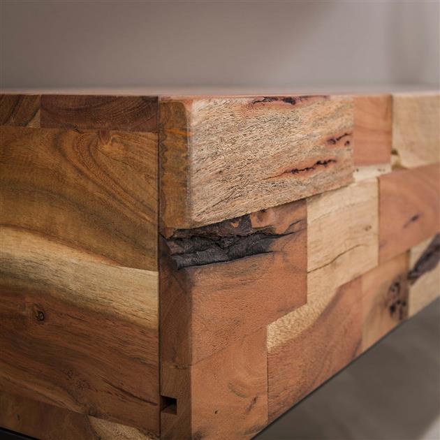 Dit tv-meubel 'Mill' is uitgevoerd in zandgestraald acacia hout in combinatie met een metalen frame. Dit model is voorzien van drie lades. Het tv-meubel is ingelegd met verschillende stroken hout en dit geeft het meubel een stoer en eigentijds karakter. Dit tv-meubel maakt deel uit van de 'Mill' serie. Over het merk