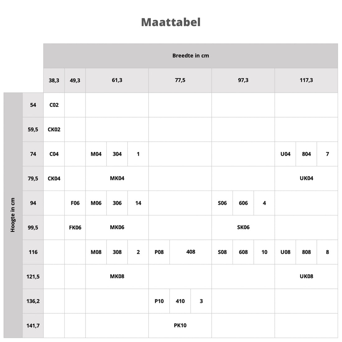 C02 = 38,3 x 54 cm CK02 = 38,3 x 59,5 cm C04 = 38,3 x 74 cm CK04 = 38,3 x 79,5 cm F06 = 49,3 x 94 cm FK06 = 49,3 x 99,5 cm M04 = 61,3 x 74 cm 304 = 61,3 x 74 cm 1 = 61,3 x 74 cm MK04 = 61,3 x 79,5 cm M06 = 61,3 x 94 cm 306 = 61,3 x 94 cm 14 = 61,3 x 94 cm MK06 = 61,3 x 99,5 cm M08 = 61,3 x 116 cm 308 = 61,3 x 116 cm 2 = 61,3 x 116 cm MK08 = 61,3 x 121,5 cm P08 = 77,5 x 116 cm 408 = 77,5 x 116 cm P10 = 77,5 x 136,2 cm 410 = 77,5 x 136,2 cm 3 = 77,5 x 136,2 cm PK10 = 77,5 x 141,7 cm S06 = 97,3 x 94 cm 606 = 97,3 x 94 cm 4 = 97,3 x 94 cm SK06 = 97,3 x 99,5 cm S08 = 97,3 x 116 cm 608 = 97,3 x 116 cm 10 = 97,3 x 116 cm U04 = 117,3 x 74 cm 804 = 117,3 x 74 cm 7 = 117,3 x 74 cm UK04 = 117,3 x 79,5 cm U08 = 117,3 x 116 cm 808 = 117,3 x 116 cm 8 = 117,3 x 116 cm UK08 = 117,3 x 121,5 cm