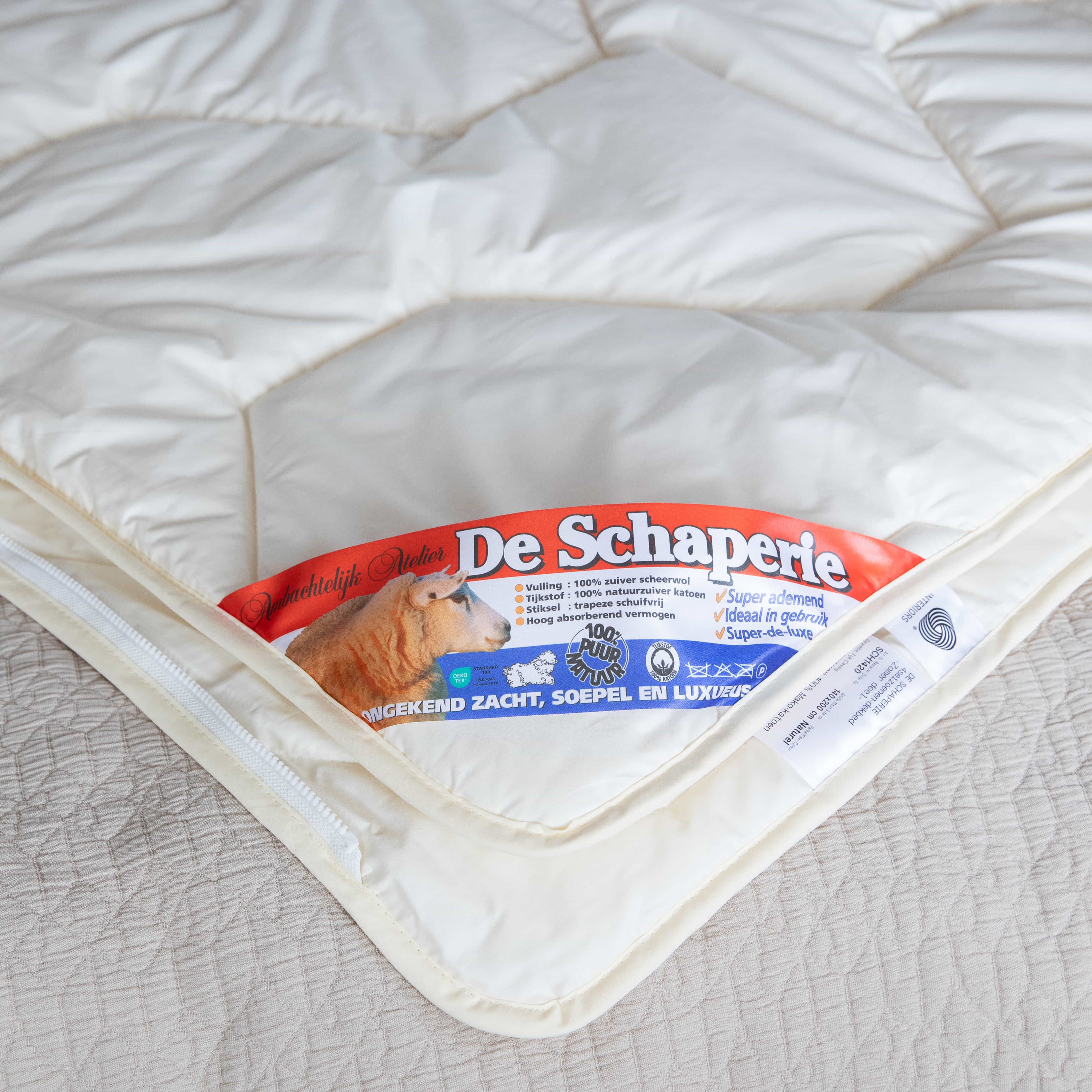 De Schaperie is een 100% zuiver scheerwollen 4-seizoenen dekbed. Puur natuurlijke wol verzorgt 'n perfect gespreide, behaaglijke warmte. Samen met het enorme absorptie en ventilatie vermogen garandeert dit een uiterst gezond en hygiënisch slaapklimaat. Bovendien bevat correct verwerkte wol 'n flinke dosis lanoline(wolvet), wat heilzaam werkt bij gevoelige en pijnlijke spieren en botten.