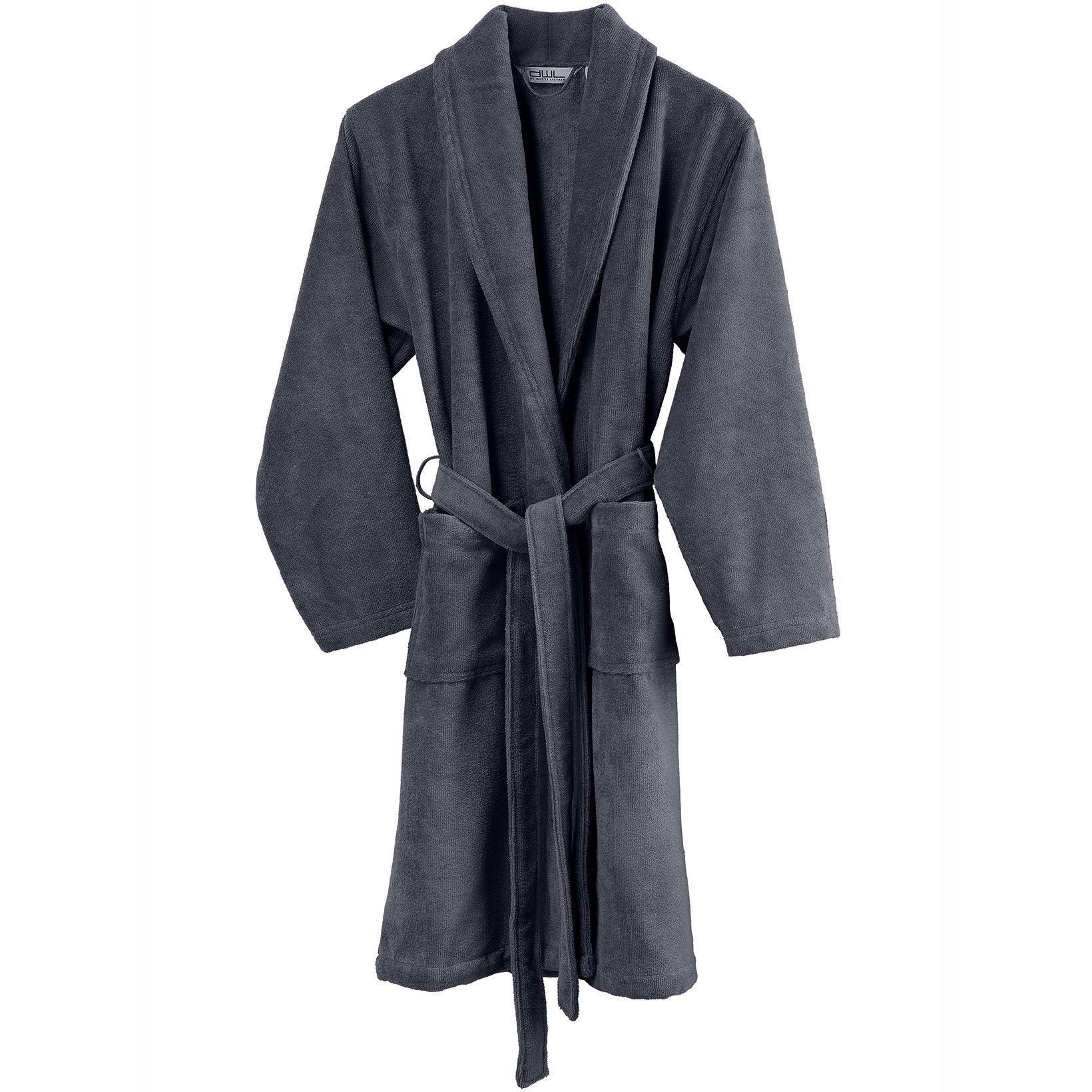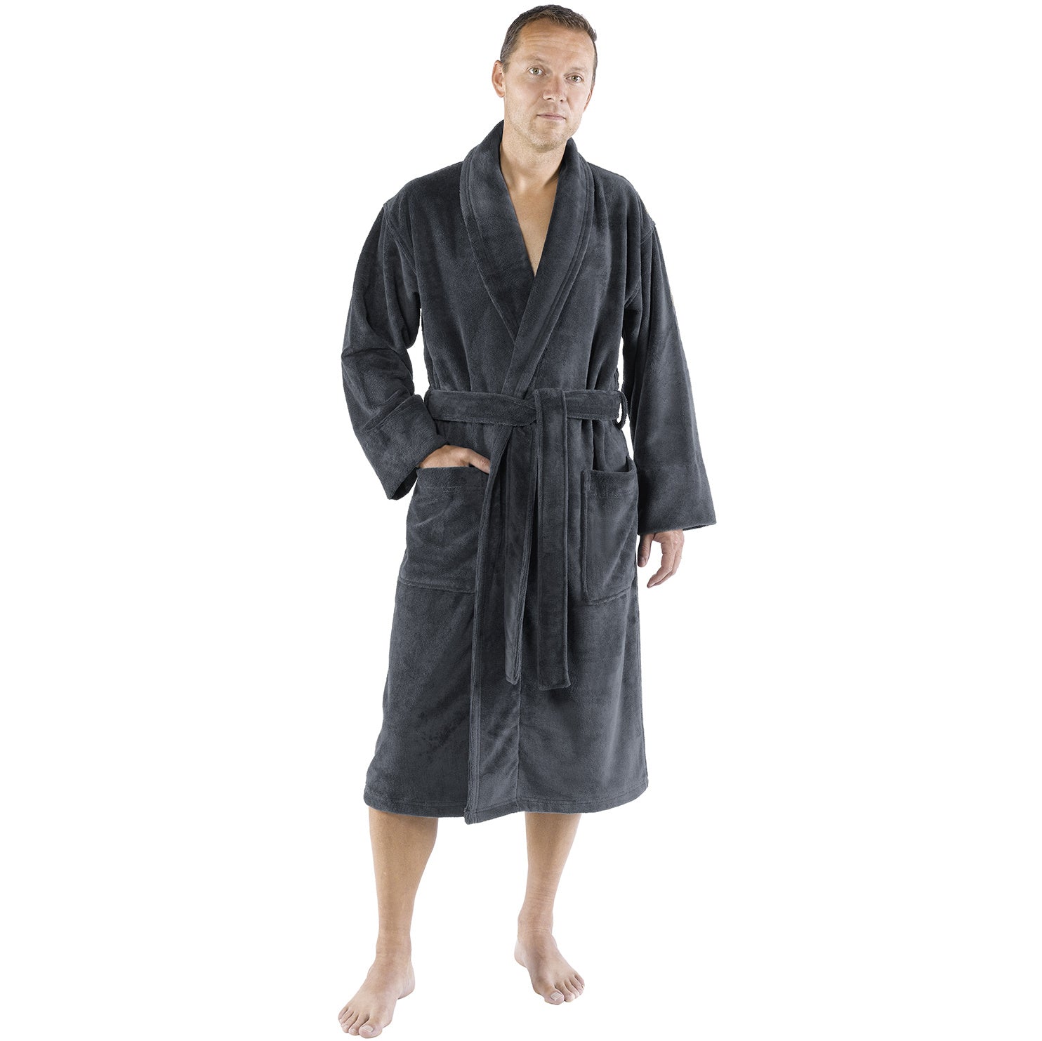 De Witte Lietaer Badjas, Gentle Dark Grey. Prachtige badjas in een neutrale kleur vervaardigd uit een heerlijke stofcombinatie. De buitenzijde is aangenaam zacht door fleece stof. De binnenzijde is gemaakt van ultra-absorberende badstof. Verder beschikt de badjas over een ceintuur, twee zakken en een sjaalkraag.